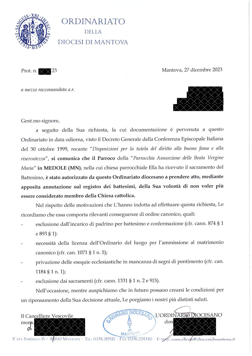 Una persona ha chiesto la rettifica dei dati relativi al proprio battesimo avvenuto a Assunzione della Beata Vergine Maria - MEDOLE (MN) il 29/12/2023, dichiarando di non voler più far parte della Chiesa Cattolica.