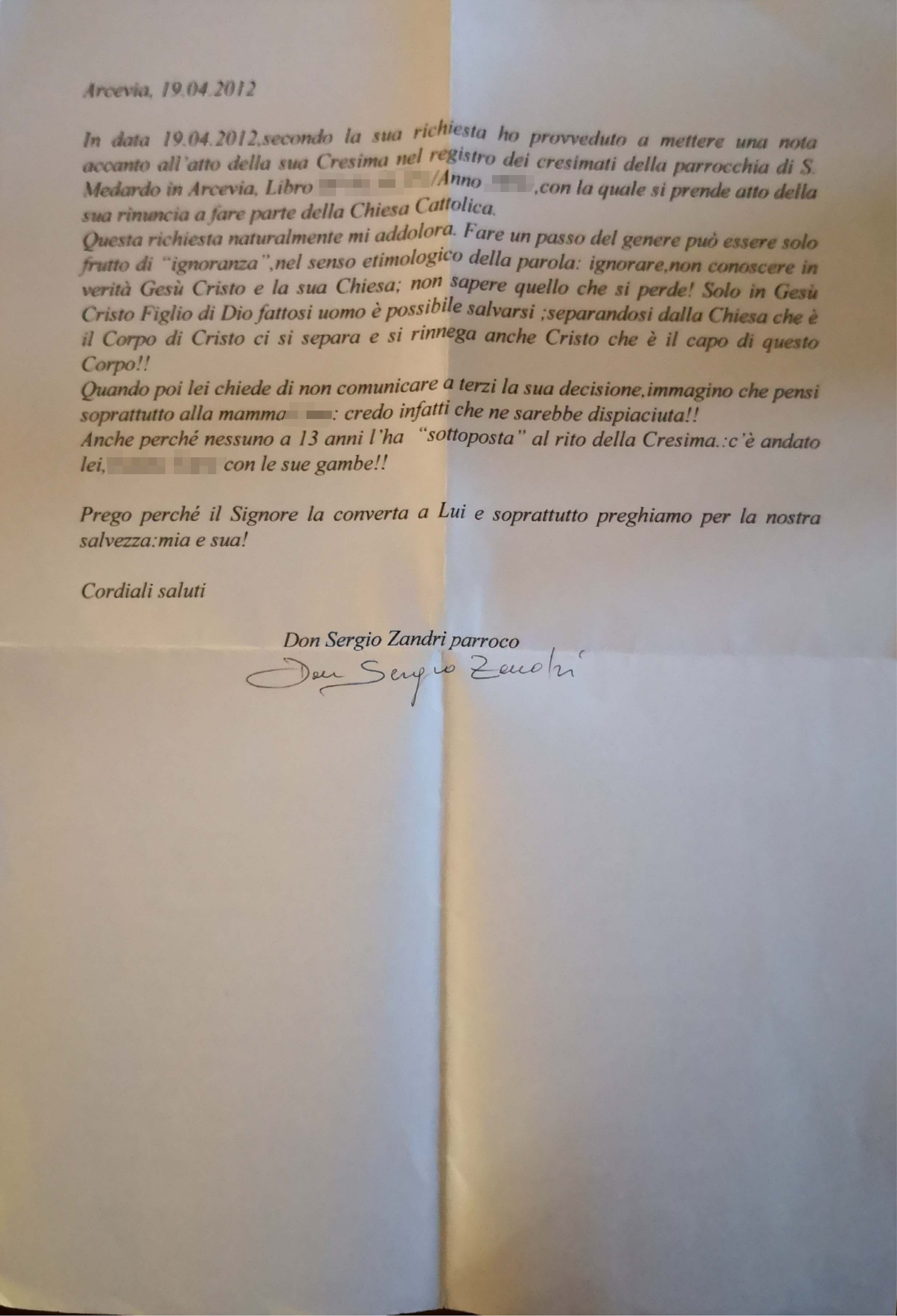 Una persona ha chiesto la rettifica dei dati relativi al proprio battesimo avvenuto a S. Medardo - ARCEVIA (AN) il 19/04/2012, dichiarando di non voler più far parte della Chiesa Cattolica.