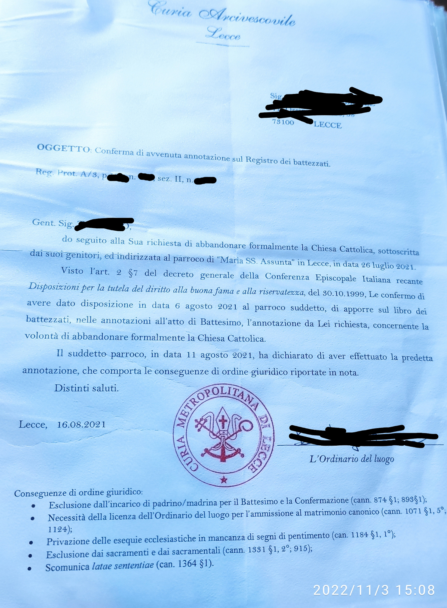 Una persona ha chiesto la rettifica dei dati relativi al proprio battesimo avvenuto a Maria Ss. Assunta - LECCE (LE) il 16/08/2021, dichiarando di non voler più far parte della Chiesa Cattolica.