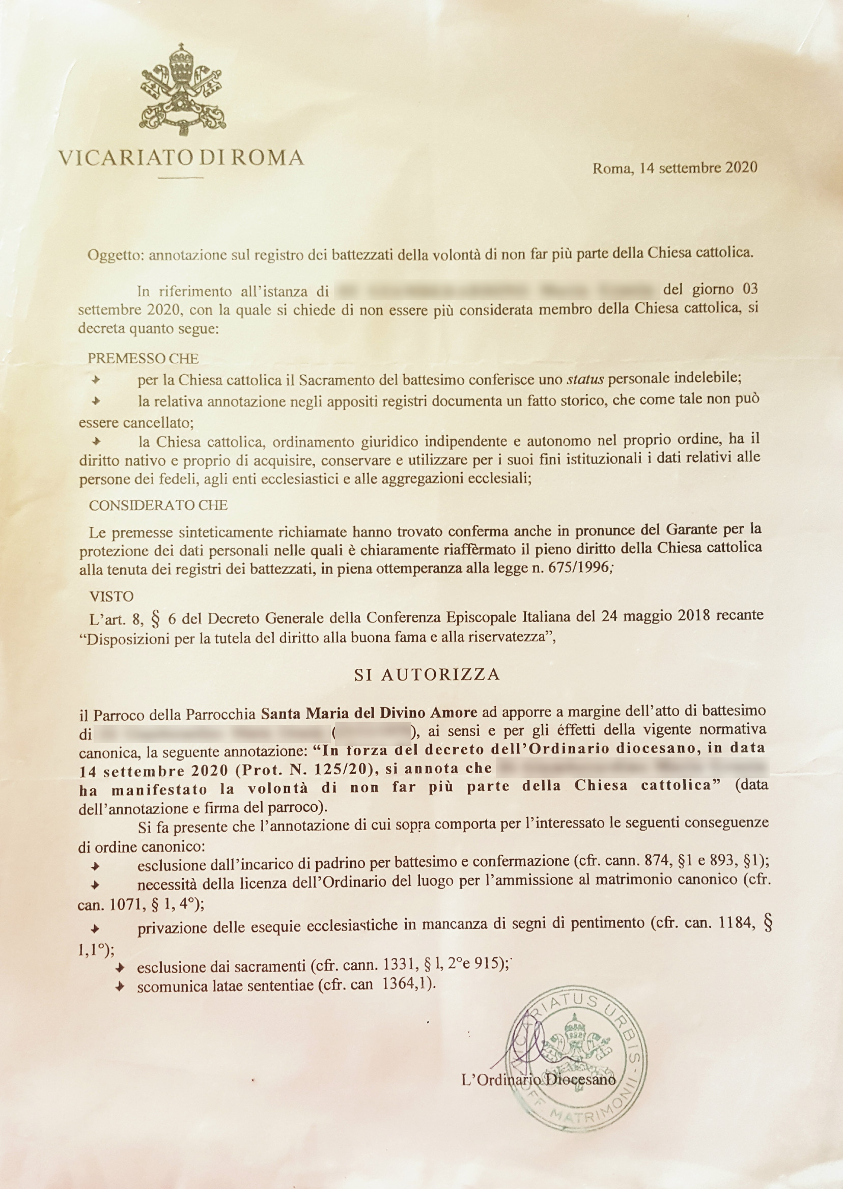 Una persona ha chiesto la rettifica dei dati relativi al proprio battesimo avvenuto a S. Maria del Divino Amore a Castel di Leva - ROMA (RM) il 14/09/2020, dichiarando di non voler più far parte della Chiesa Cattolica.