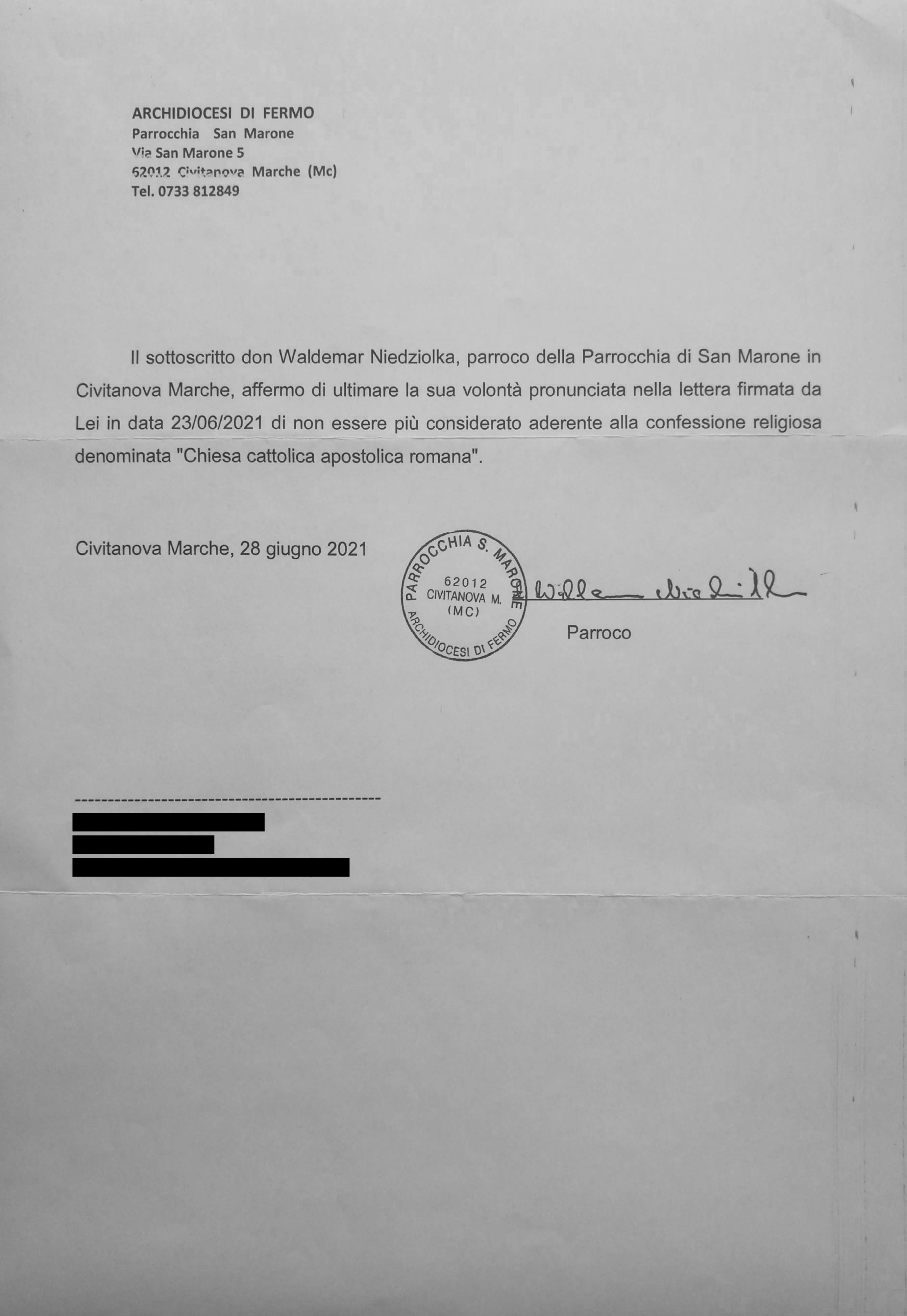 Una persona ha chiesto la rettifica dei dati relativi al proprio battesimo avvenuto a S. Marone - CIVITANOVA MARCHE (MC) il 28/06/2021, dichiarando di non voler più far parte della Chiesa Cattolica.