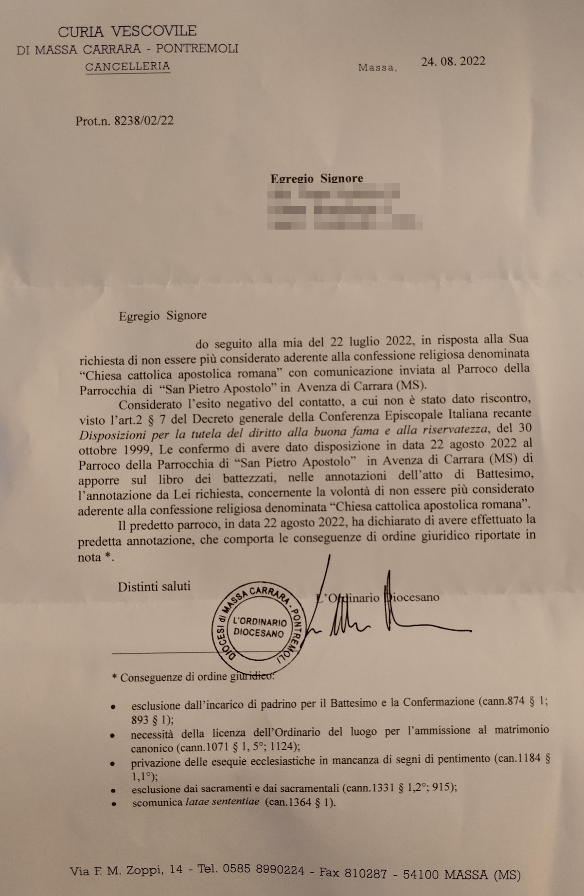 Una persona ha chiesto la rettifica dei dati relativi al proprio battesimo avvenuto a Sacra Famiglia - CARRARA (MS) il 24/08/2022, dichiarando di non voler più far parte della Chiesa Cattolica.