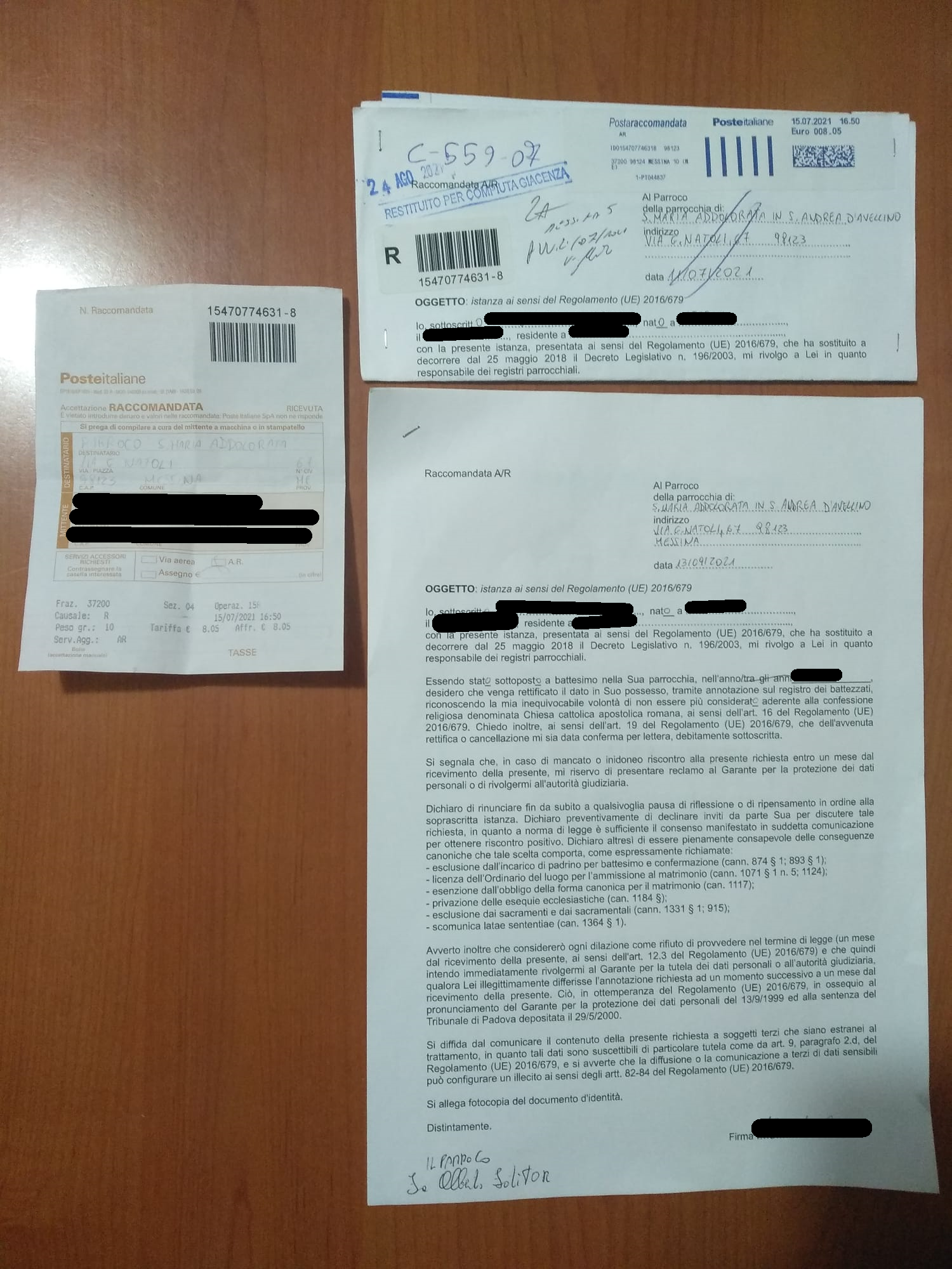 Dopo aver inviato la raccomandata A/R il 15/07/2021 alla parrocchia, ho atteso fino al 24/08/2021, data in cui la raccomandata mi è stata restituita per compiuta giacenza. Avevo cercato di sollecitare la ricezione della lettera tramite PEC alla diocesi il 12/08/2021, senza successo. Finalmente, il 13/08/2021, mi sono recato, dopo essermi consultato con l'UAAR, direttamente dal parroco insieme a due testimoni, dopo aver compilato in duplice copia l'istanza di sbattezzo. Ho spiegato tutto l'iter infruttuoso e il prete ha preso per sé una copia da apporre al registro e controfirmato quella in mio possesso.