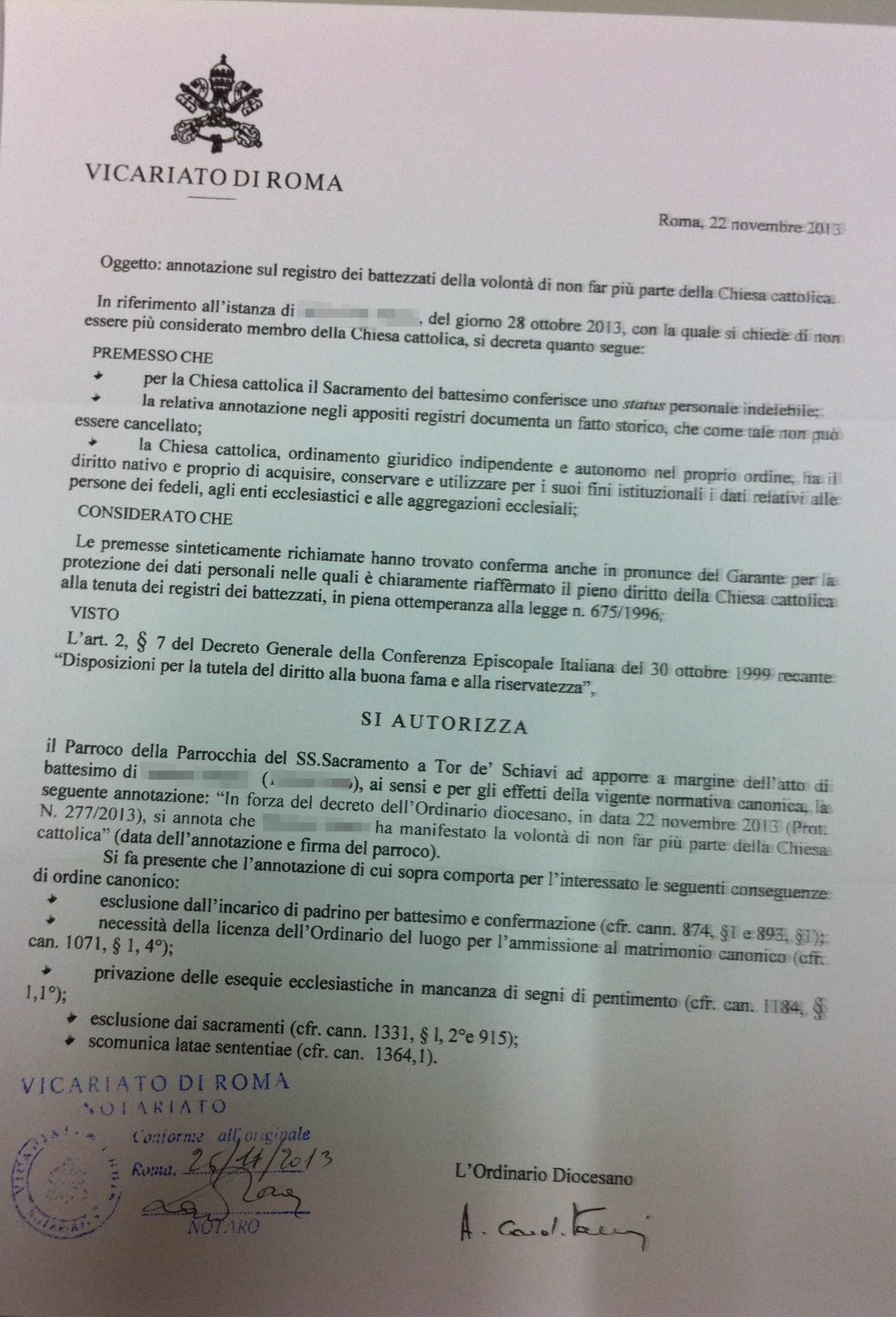 Una persona ha chiesto la rettifica dei dati relativi al proprio battesimo avvenuto a Ss. Sacramento a Tor de' Schiavi - ROMA (RM) il 22/11/2013, dichiarando di non voler più far parte della Chiesa Cattolica.