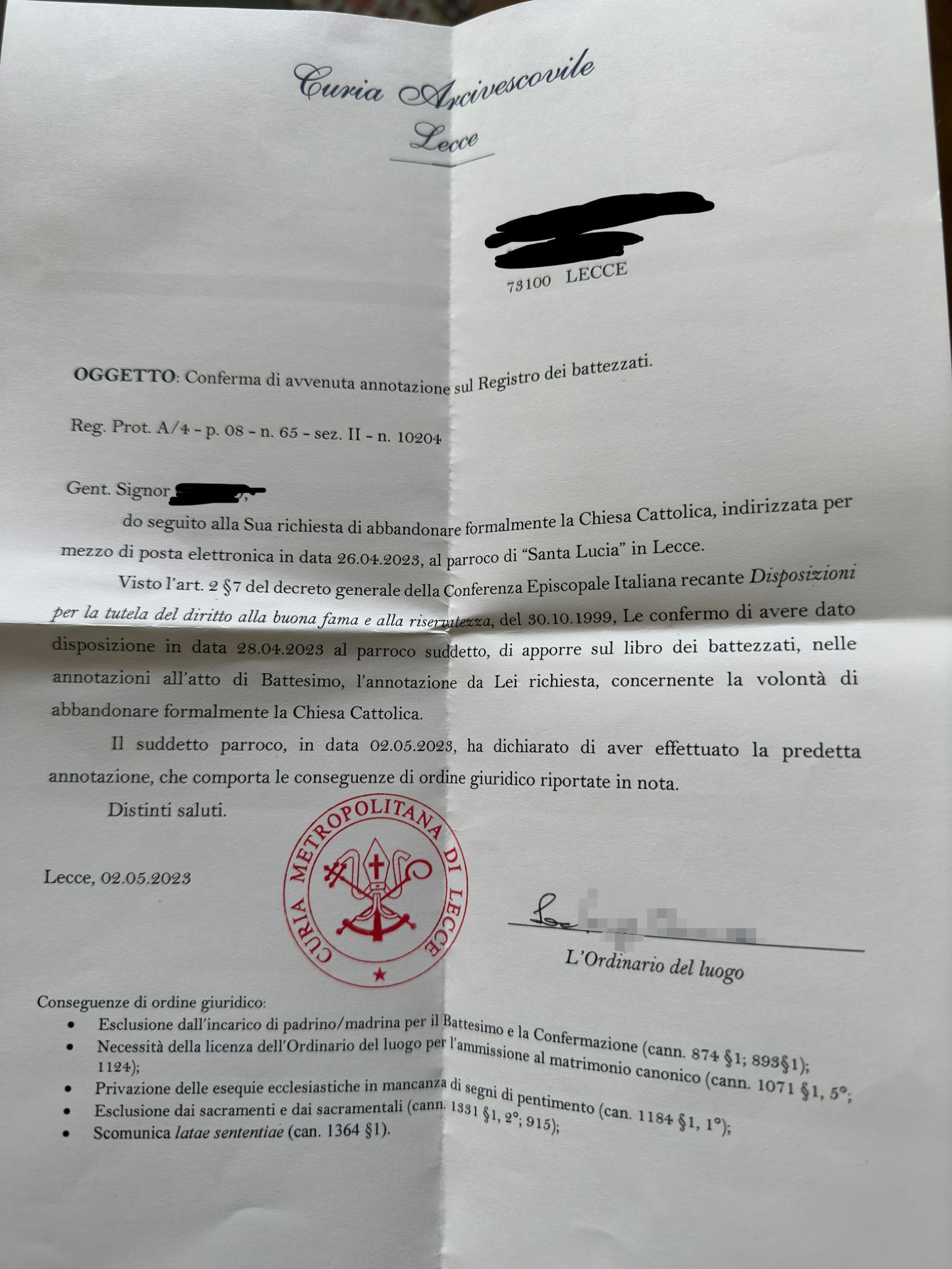 Una persona ha chiesto la rettifica dei dati relativi al proprio battesimo avvenuto a S. Lucia - LECCE (LE) il 11/05/2023, dichiarando di non voler più far parte della Chiesa Cattolica.