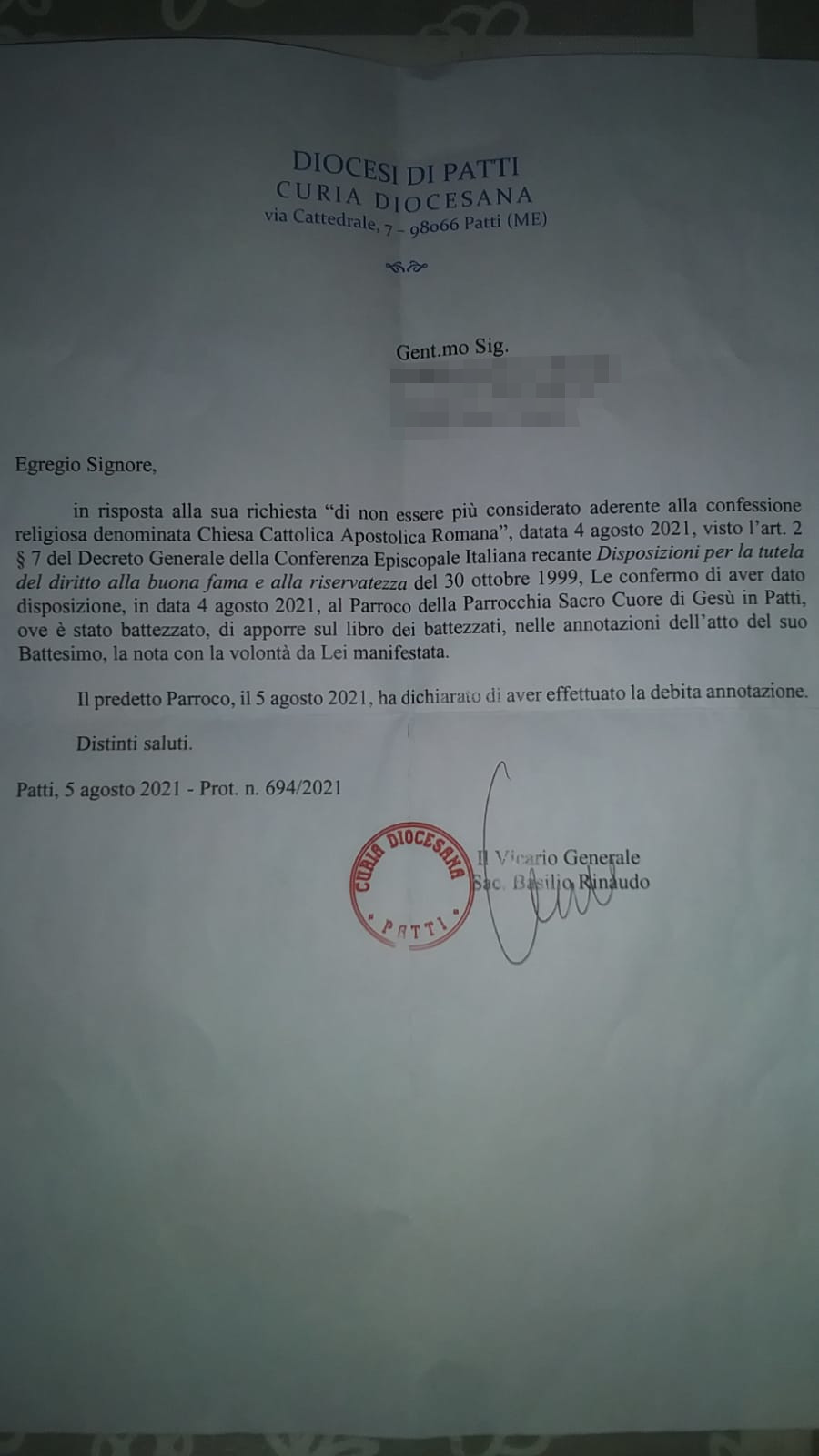 Una persona ha chiesto la rettifica dei dati relativi al proprio battesimo avvenuto a S. Cuore di Gesù - PATTI (ME) il 10/10/2021, dichiarando di non voler più far parte della Chiesa Cattolica.