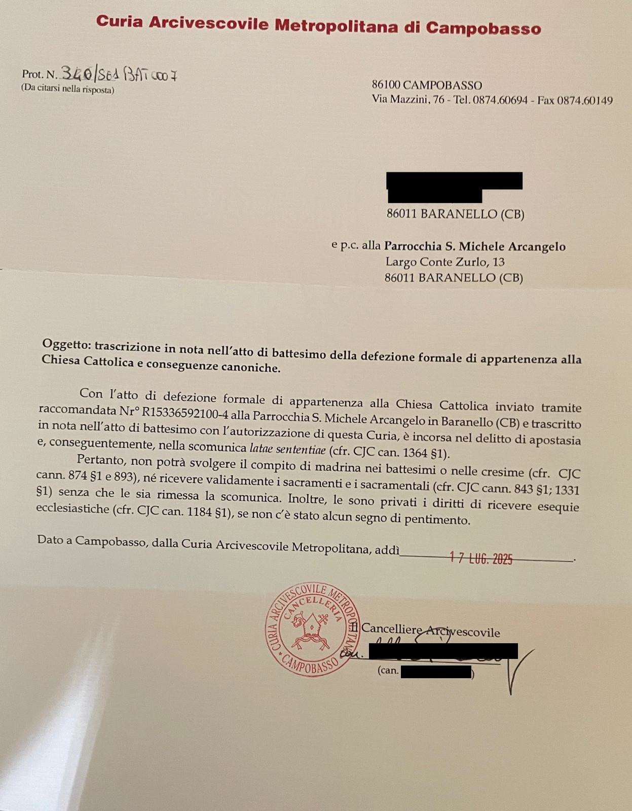 Una persona ha chiesto la rettifica dei dati relativi al proprio battesimo avvenuto a San Michele Arcangelo - BARANELLO (CB) il 07/07/2025, dichiarando di non voler più far parte della Chiesa Cattolica.