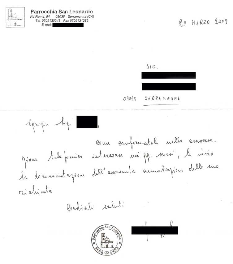 Una persona ha chiesto la rettifica dei dati relativi al proprio battesimo avvenuto a S. Leonardo - SERRAMANNA (SU) il 20/03/2009, dichiarando di non voler più far parte della Chiesa Cattolica.