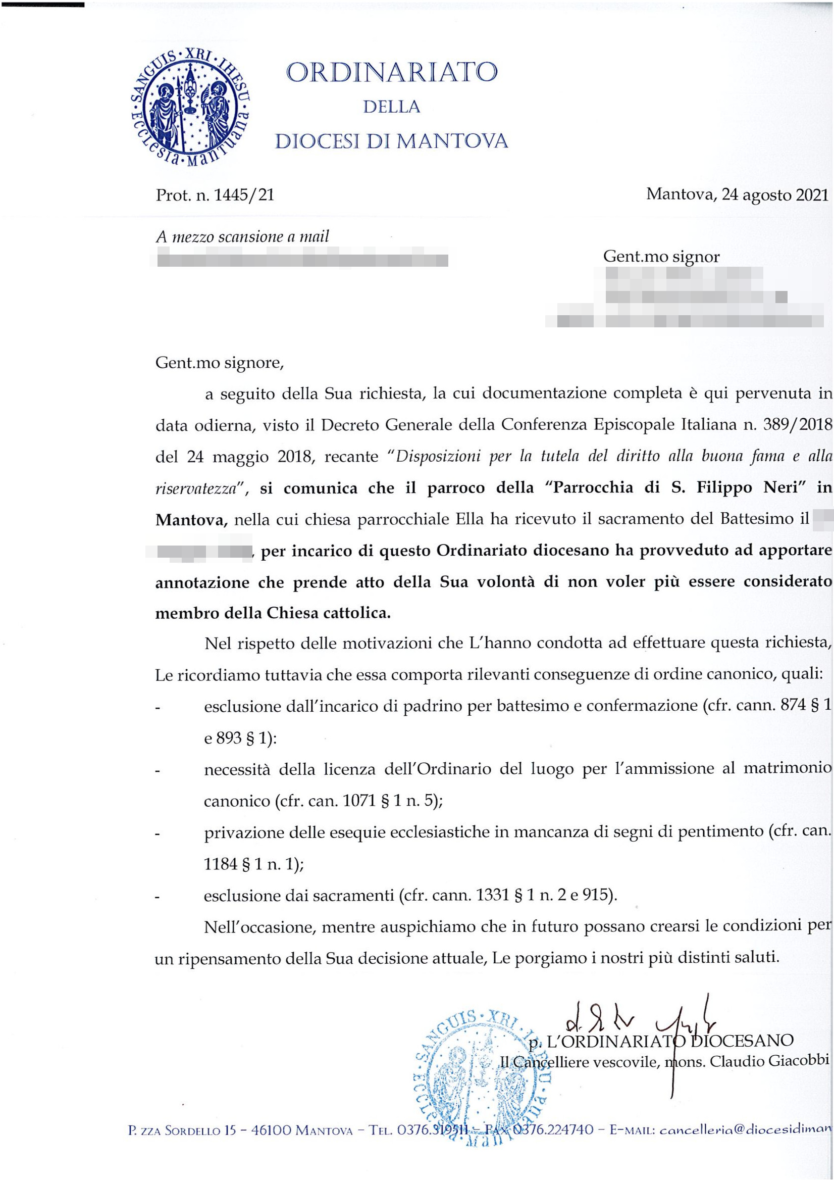 Una persona ha chiesto la rettifica dei dati relativi al proprio battesimo avvenuto a S. Filippo Neri Sacerdote - MANTOVA (MN) il 24/08/2021, dichiarando di non voler più far parte della Chiesa Cattolica.