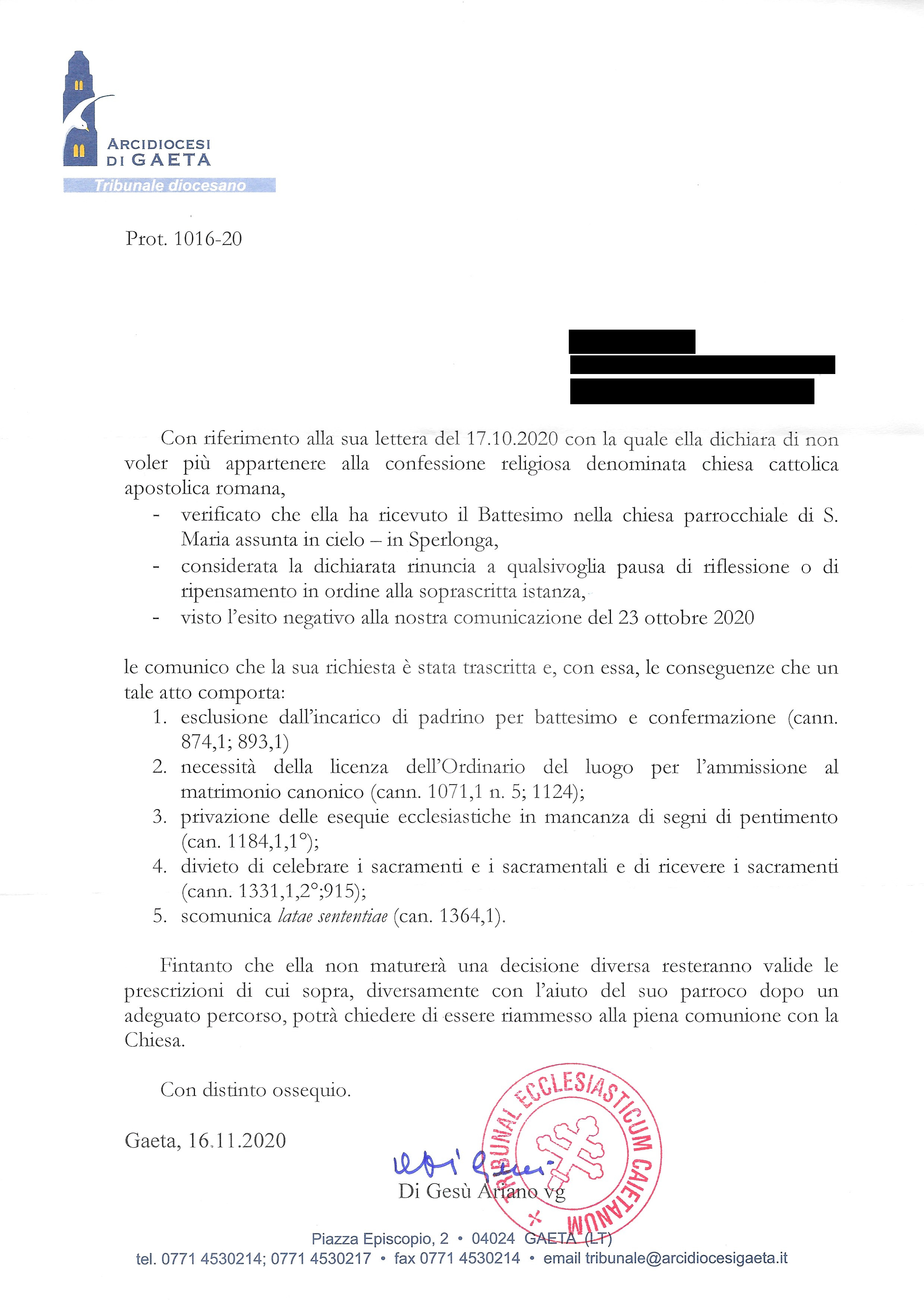 Una persona ha chiesto la rettifica dei dati relativi al proprio battesimo avvenuto a S. Maria Assunta in Cielo - SPERLONGA (LT) il 16/11/2020, dichiarando di non voler più far parte della Chiesa Cattolica.