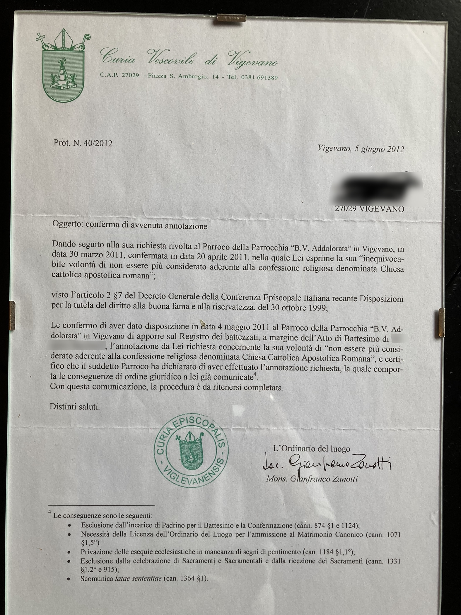 Una persona ha chiesto la rettifica dei dati relativi al proprio battesimo avvenuto a Beata V. Addolorata - VIGEVANO (PV) il 05/06/2012, dichiarando di non voler più far parte della Chiesa Cattolica.