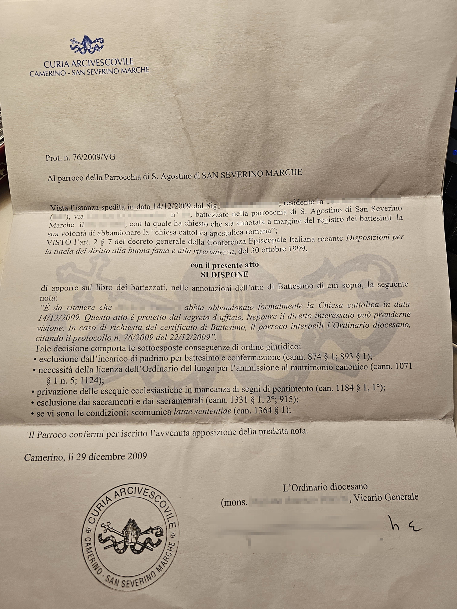 Una persona ha chiesto la rettifica dei dati relativi al proprio battesimo avvenuto a S. Agostino - SAN SEVERINO MARCHE (MC) il 29/12/2009, dichiarando di non voler più far parte della Chiesa Cattolica.