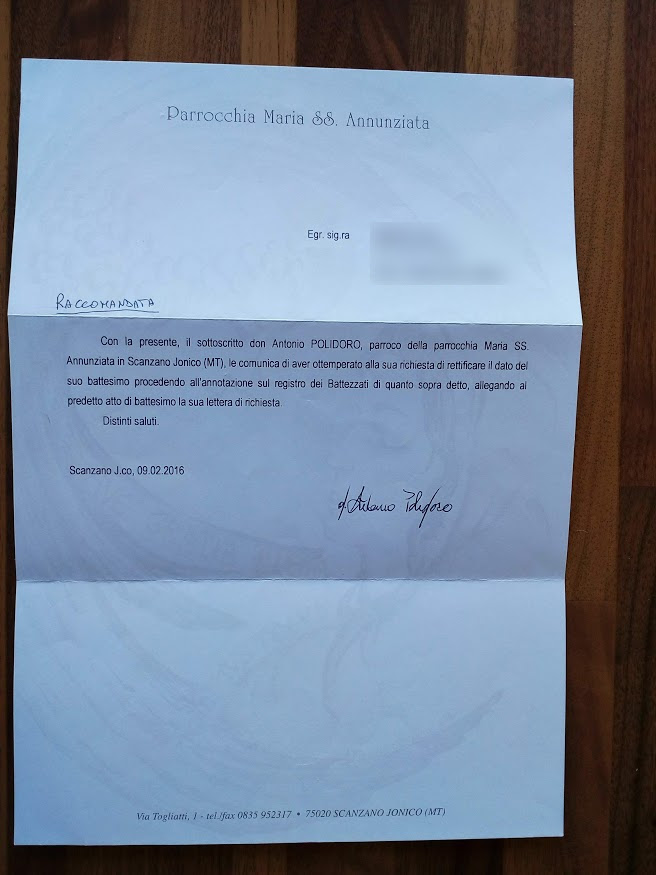 Una persona ha chiesto la rettifica dei dati relativi al proprio battesimo avvenuto a Maria Ss. Annunziata - SCANZANO JONICO (MT) il 09/02/2016, dichiarando di non voler più far parte della Chiesa Cattolica.