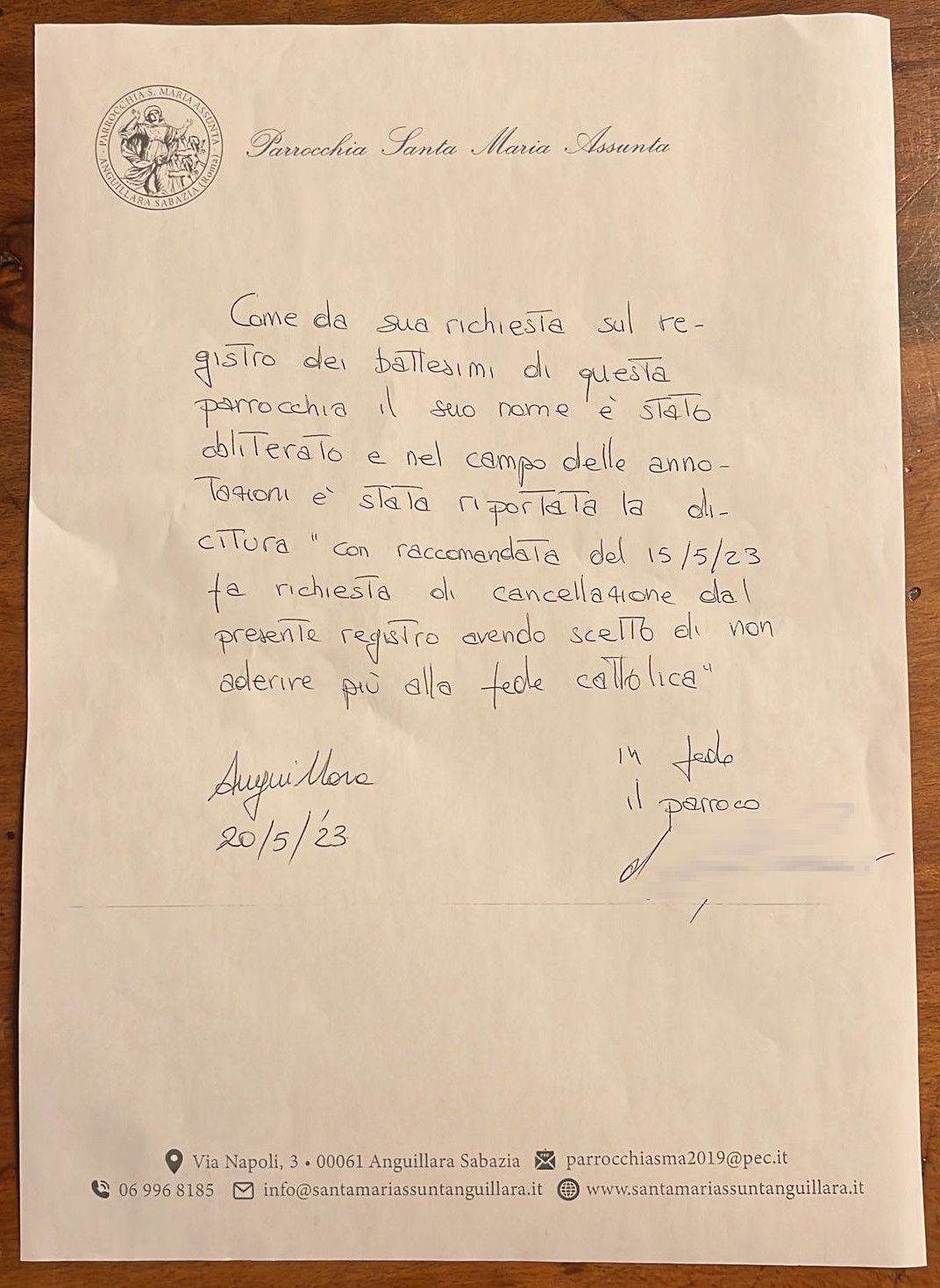 Una persona ha chiesto la rettifica dei dati relativi al proprio battesimo avvenuto a Santa Maria Assunta - ANGUILLARA SABAZIA (RM) il 20/05/2023, dichiarando di non voler più far parte della Chiesa Cattolica.