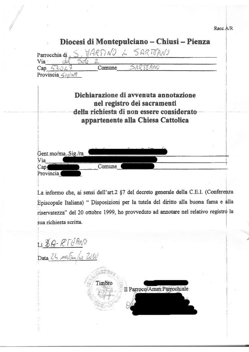 Una persona ha chiesto la rettifica dei dati relativi al proprio battesimo avvenuto a S. Martino - SARTEANO (SI) il 24/11/2010, dichiarando di non voler più far parte della Chiesa Cattolica.