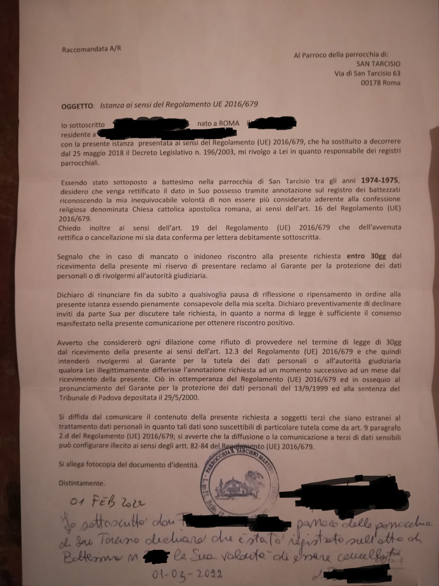 Una persona ha chiesto la rettifica dei dati relativi al proprio battesimo avvenuto a S. Tarcisio - ROMA (RM) il 01/03/2022, dichiarando di non voler più far parte della Chiesa Cattolica.