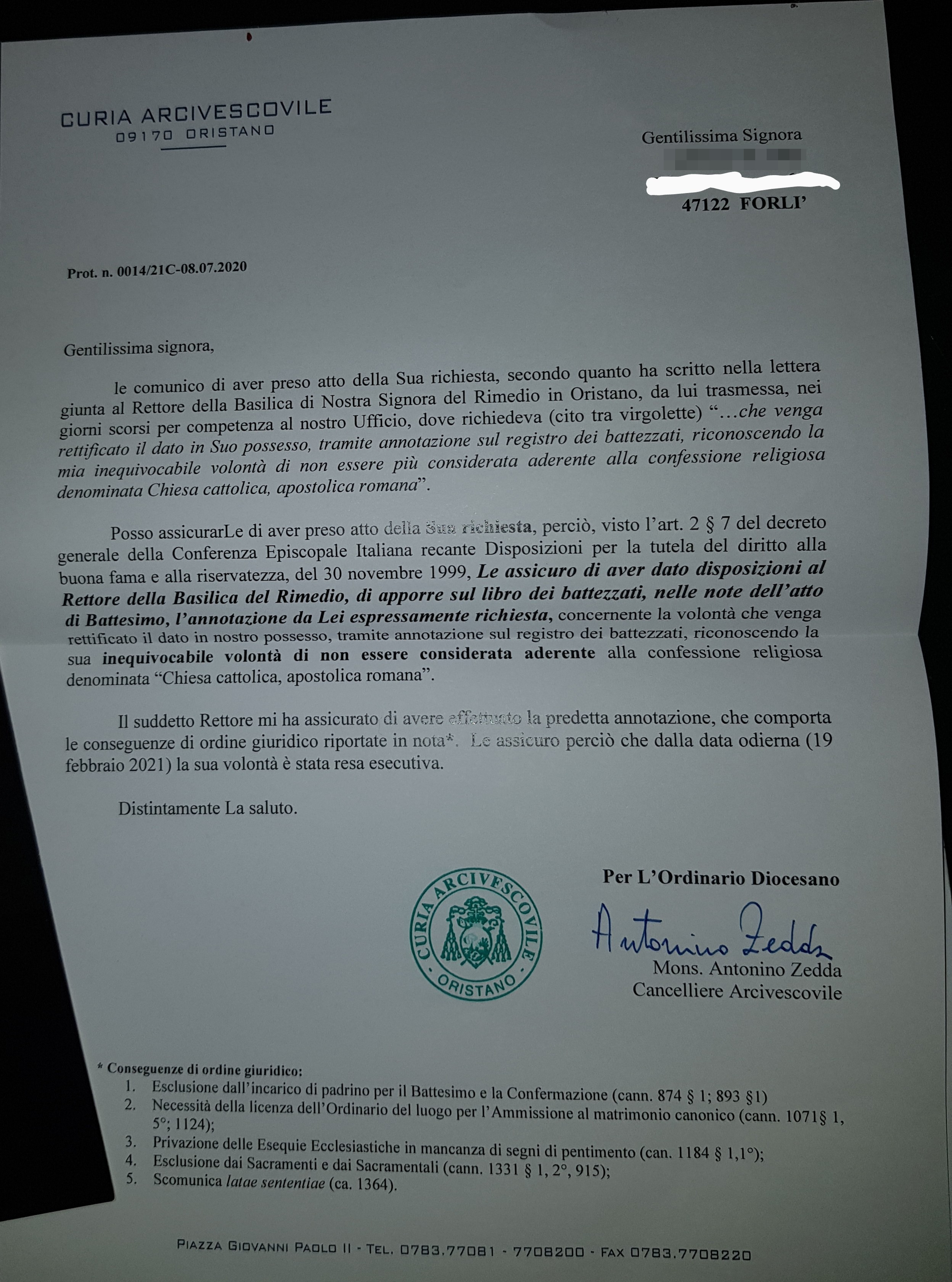 Una persona ha chiesto la rettifica dei dati relativi al proprio battesimo avvenuto a Nostra Signora del Rimedio - ORISTANO (OR) il 19/02/2021, dichiarando di non voler più far parte della Chiesa Cattolica.