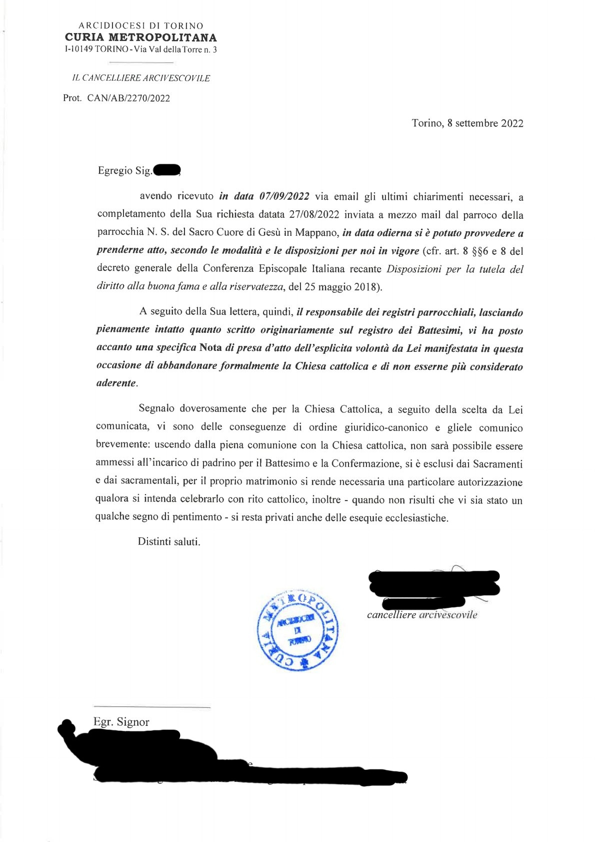 Una persona ha chiesto la rettifica dei dati relativi al proprio battesimo avvenuto a Nostra Signora del Sacro Cuore di Gesù - MAPPANO (TO) il 08/09/2022, dichiarando di non voler più far parte della Chiesa Cattolica.