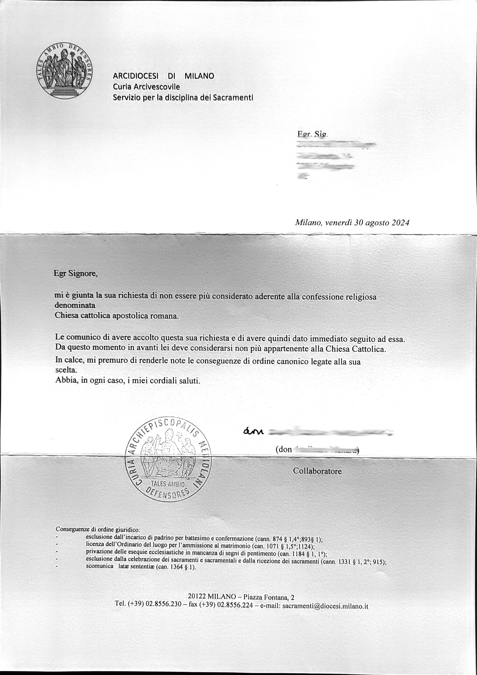 Una persona ha chiesto la rettifica dei dati relativi al proprio battesimo avvenuto a S. Martino V. - MAGENTA (MI) il 30/08/2024, dichiarando di non voler più far parte della Chiesa Cattolica.