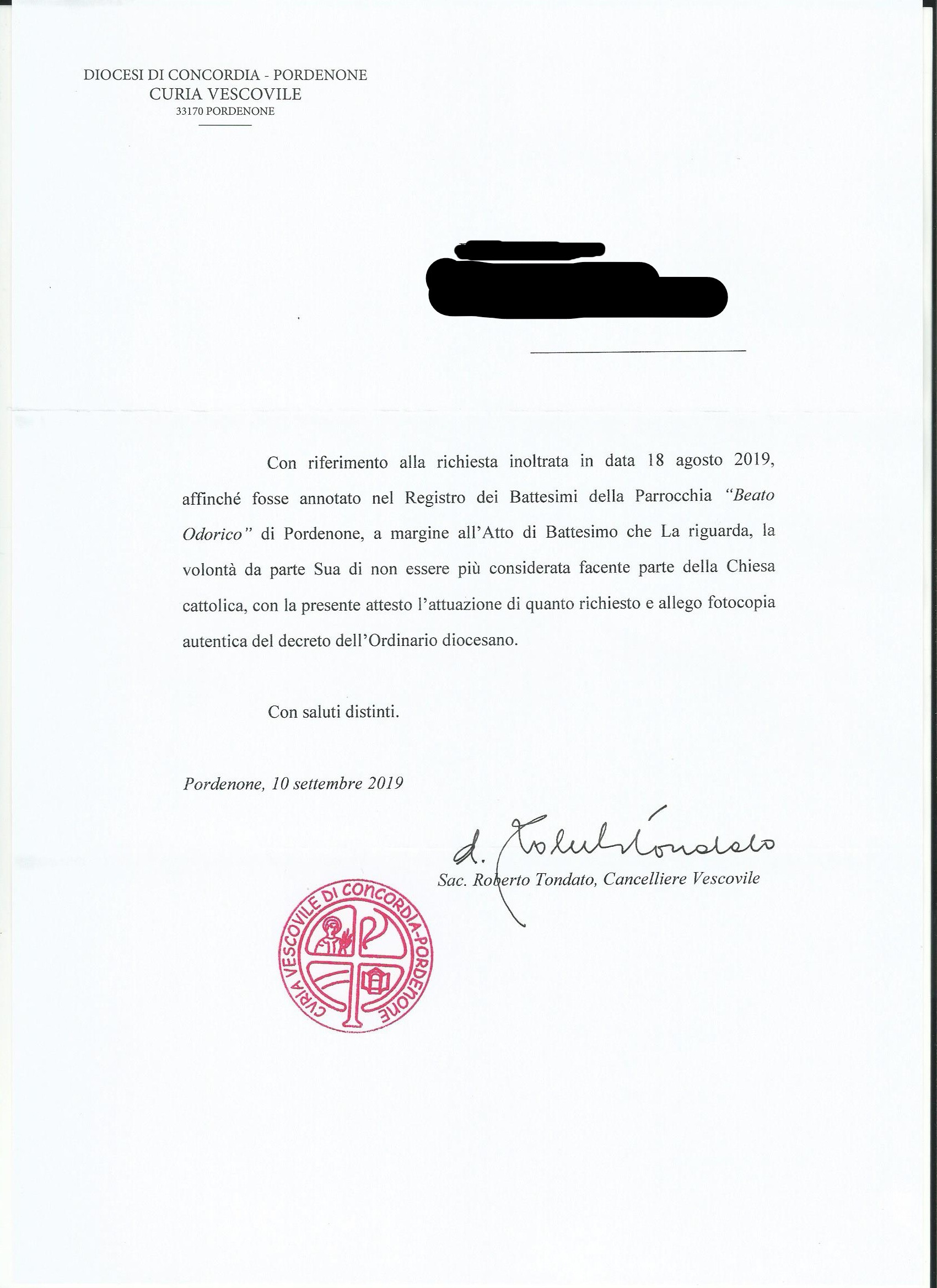 Una persona ha chiesto la rettifica dei dati relativi al proprio battesimo avvenuto a Beato Odorico Da Pordenone - PORDENONE (PN) il 10/09/2019, dichiarando di non voler più far parte della Chiesa Cattolica.