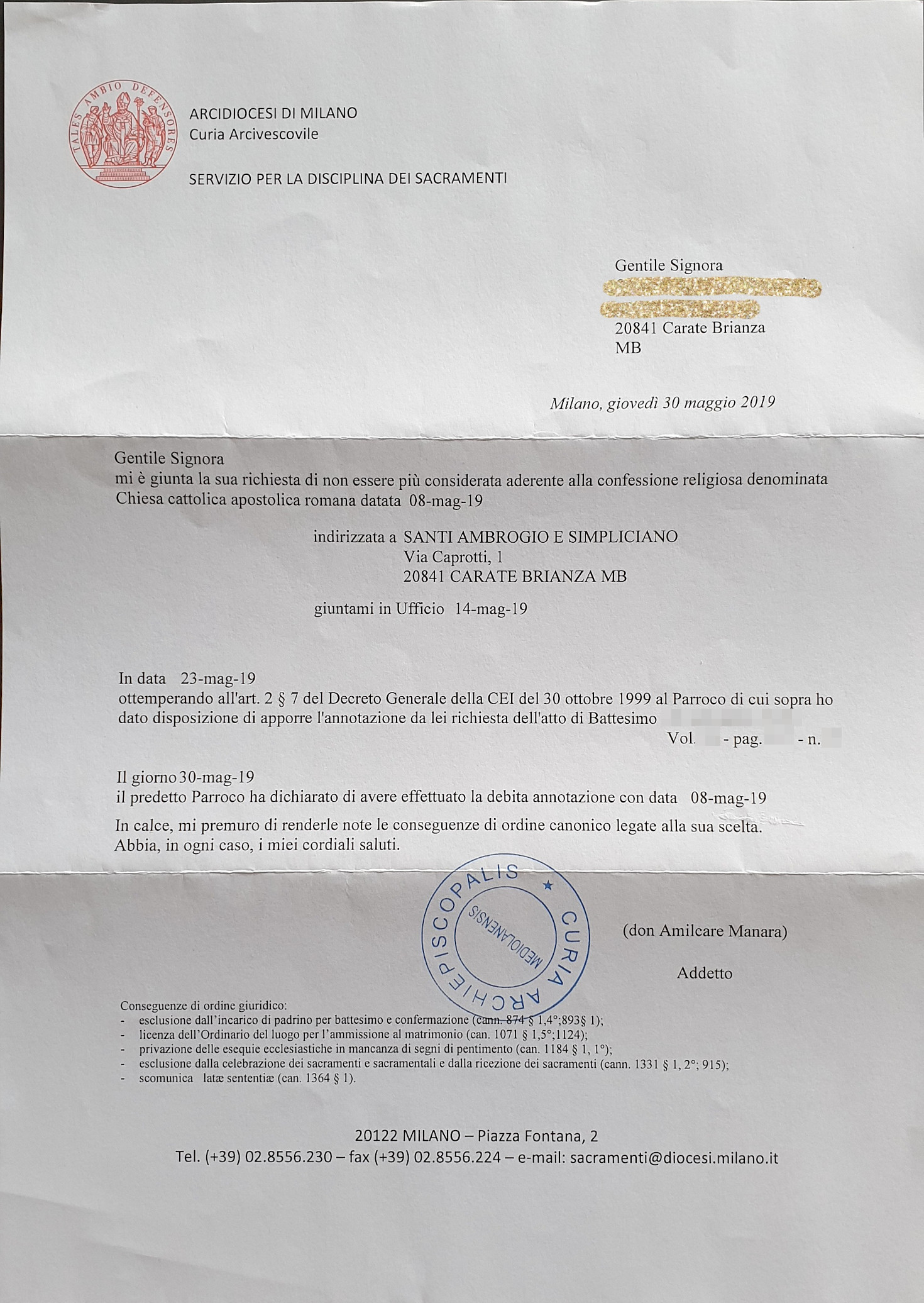 Una persona ha chiesto la rettifica dei dati relativi al proprio battesimo avvenuto a Santi Ambrogio e Simpliciano - CARATE BRIANZA (MB) il 23/05/2019, dichiarando di non voler più far parte della Chiesa Cattolica.