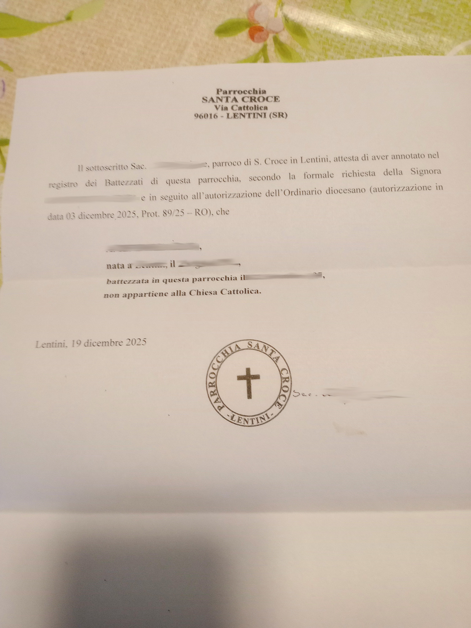 Una persona ha chiesto la rettifica dei dati relativi al proprio battesimo avvenuto a S. Croce - LENTINI (SR) il 19/12/2025, dichiarando di non voler più far parte della Chiesa Cattolica.