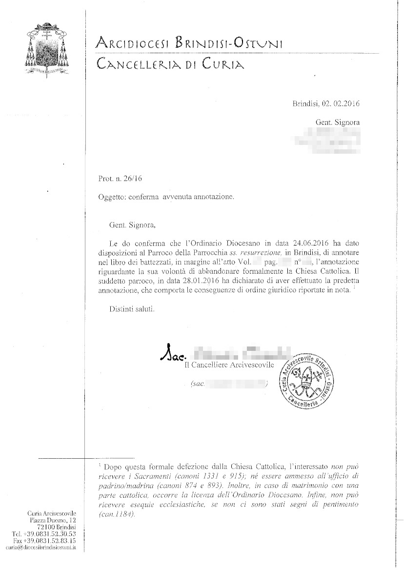Una persona ha chiesto la rettifica dei dati relativi al proprio battesimo avvenuto a Ss. Resurrezione - BRINDISI (BR) il 02/06/2016, dichiarando di non voler più far parte della Chiesa Cattolica.