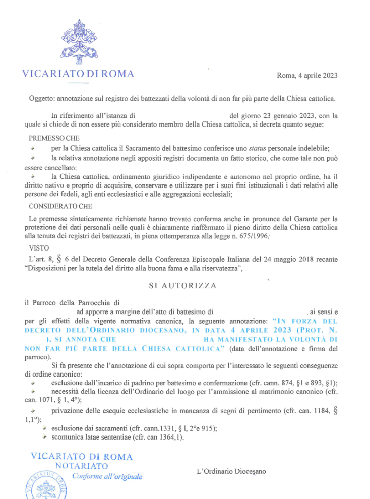 Una persona ha chiesto la rettifica dei dati relativi al proprio battesimo avvenuto a S. Maria del Rosario ai Martiri Portuensi - ROMA (RM) il 04/04/2023, dichiarando di non voler più far parte della Chiesa Cattolica.