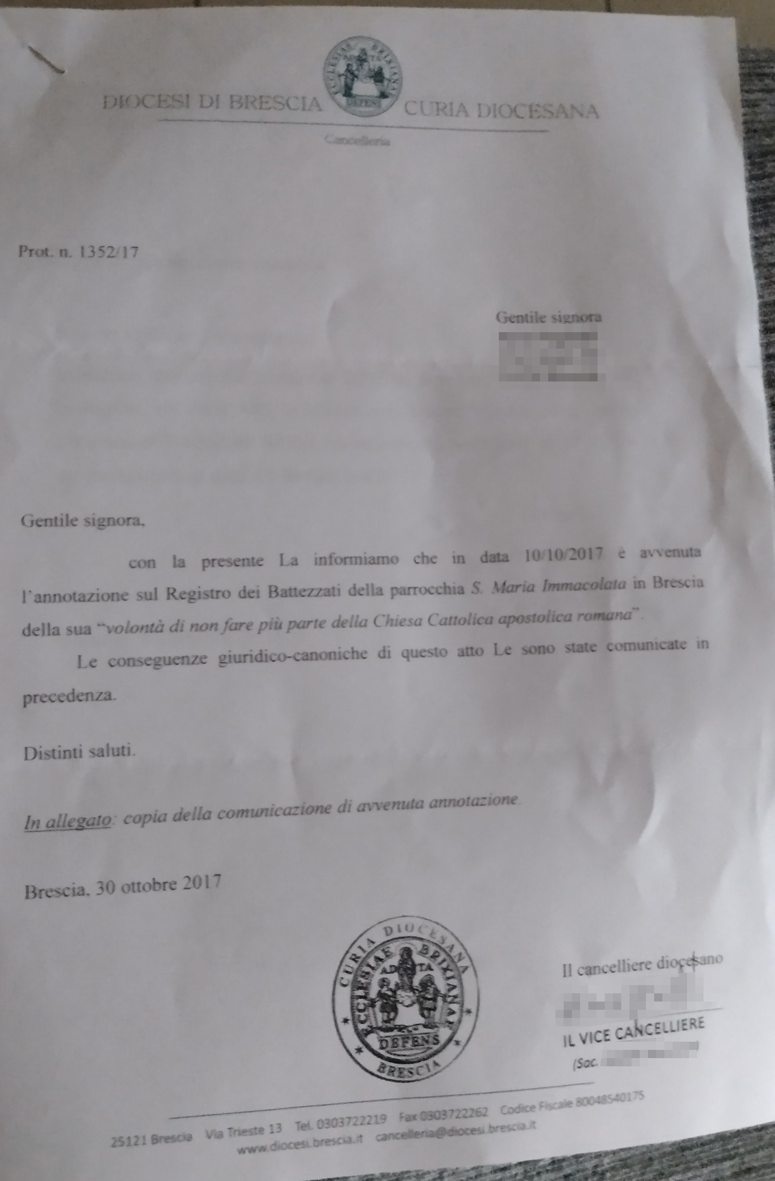 Una persona ha chiesto la rettifica dei dati relativi al proprio battesimo avvenuto a Santa Maria Immacolata - BRESCIA (BS) il 30/10/2017, dichiarando di non voler più far parte della Chiesa Cattolica.