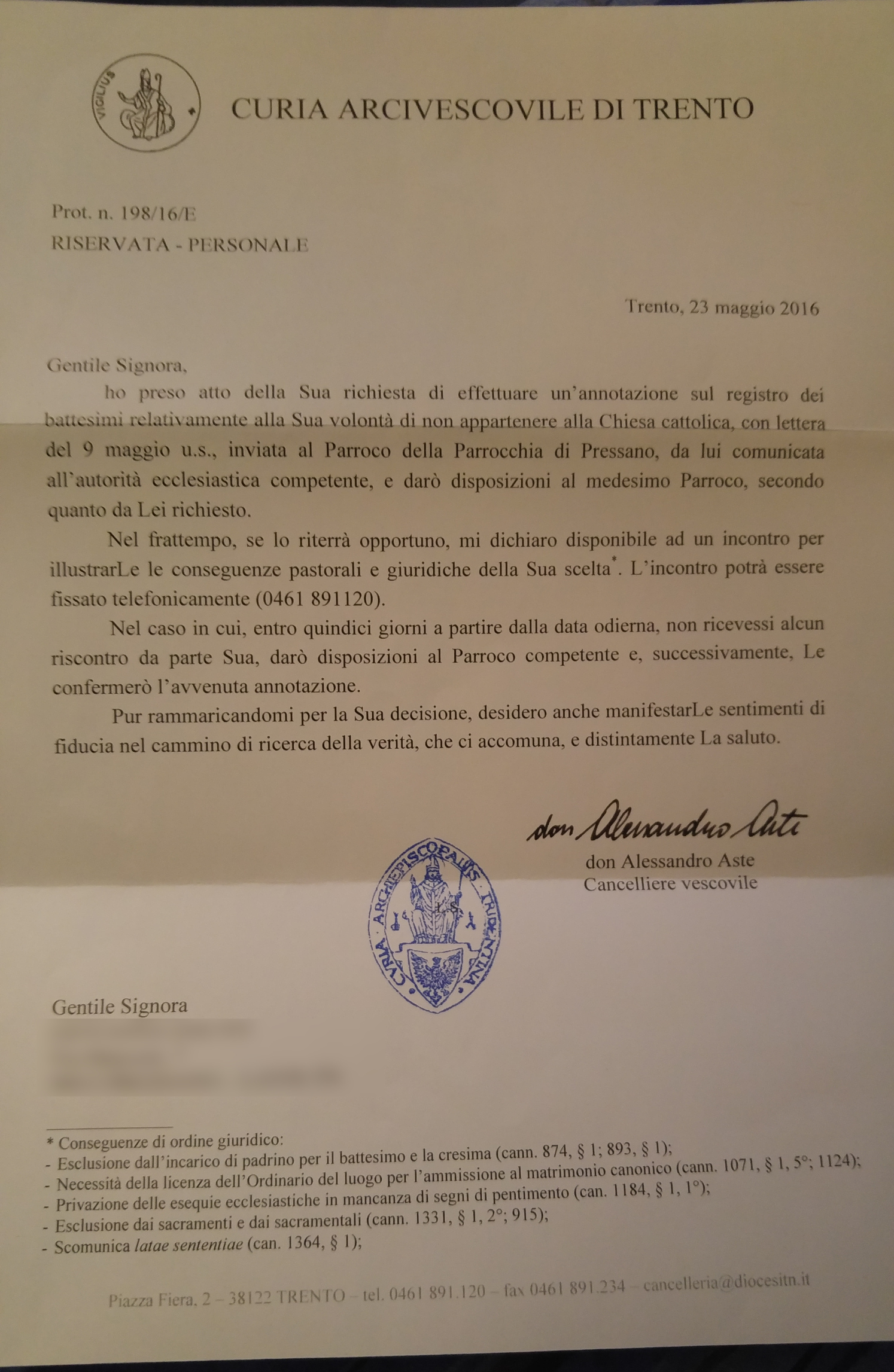 Una persona ha chiesto la rettifica dei dati relativi al proprio battesimo avvenuto a Parrocchia di San Felice da Nola - LAVIS (TN) il 23/05/2016, dichiarando di non voler più far parte della Chiesa Cattolica.