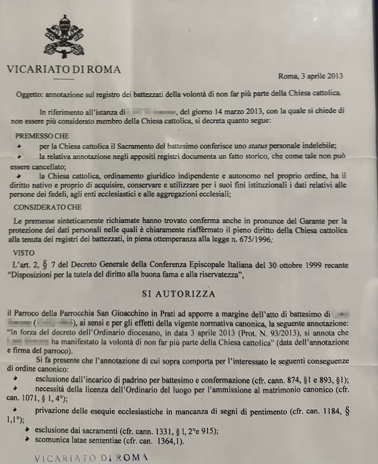Una persona ha chiesto la rettifica dei dati relativi al proprio battesimo avvenuto a S. Agnese Fuori Le Mura - ROMA (RM) il 03/04/2013, dichiarando di non voler più far parte della Chiesa Cattolica.