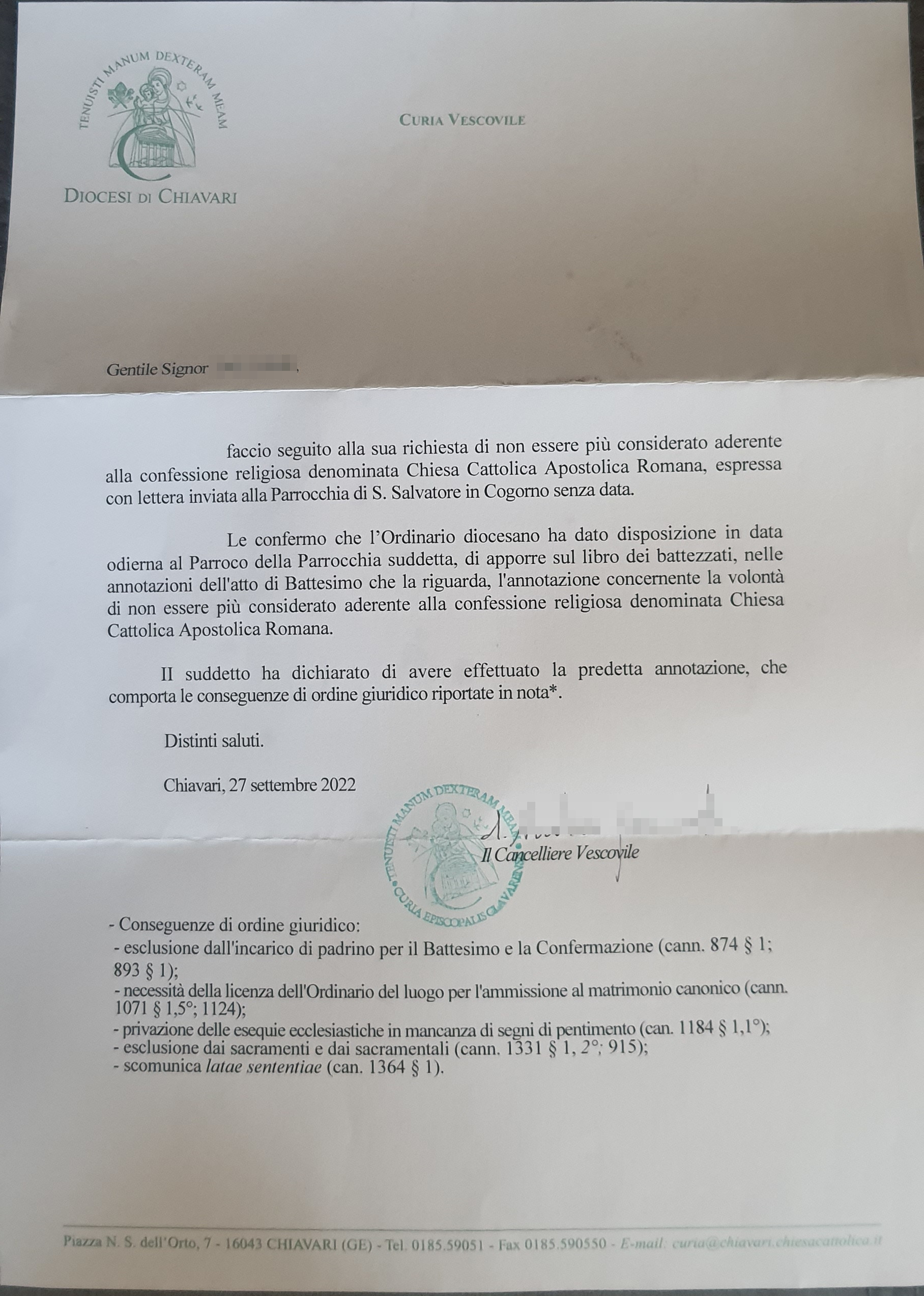 Una persona ha chiesto la rettifica dei dati relativi al proprio battesimo avvenuto a S. Salvatore - COGORNO (GE) il 27/09/2022, dichiarando di non voler più far parte della Chiesa Cattolica.