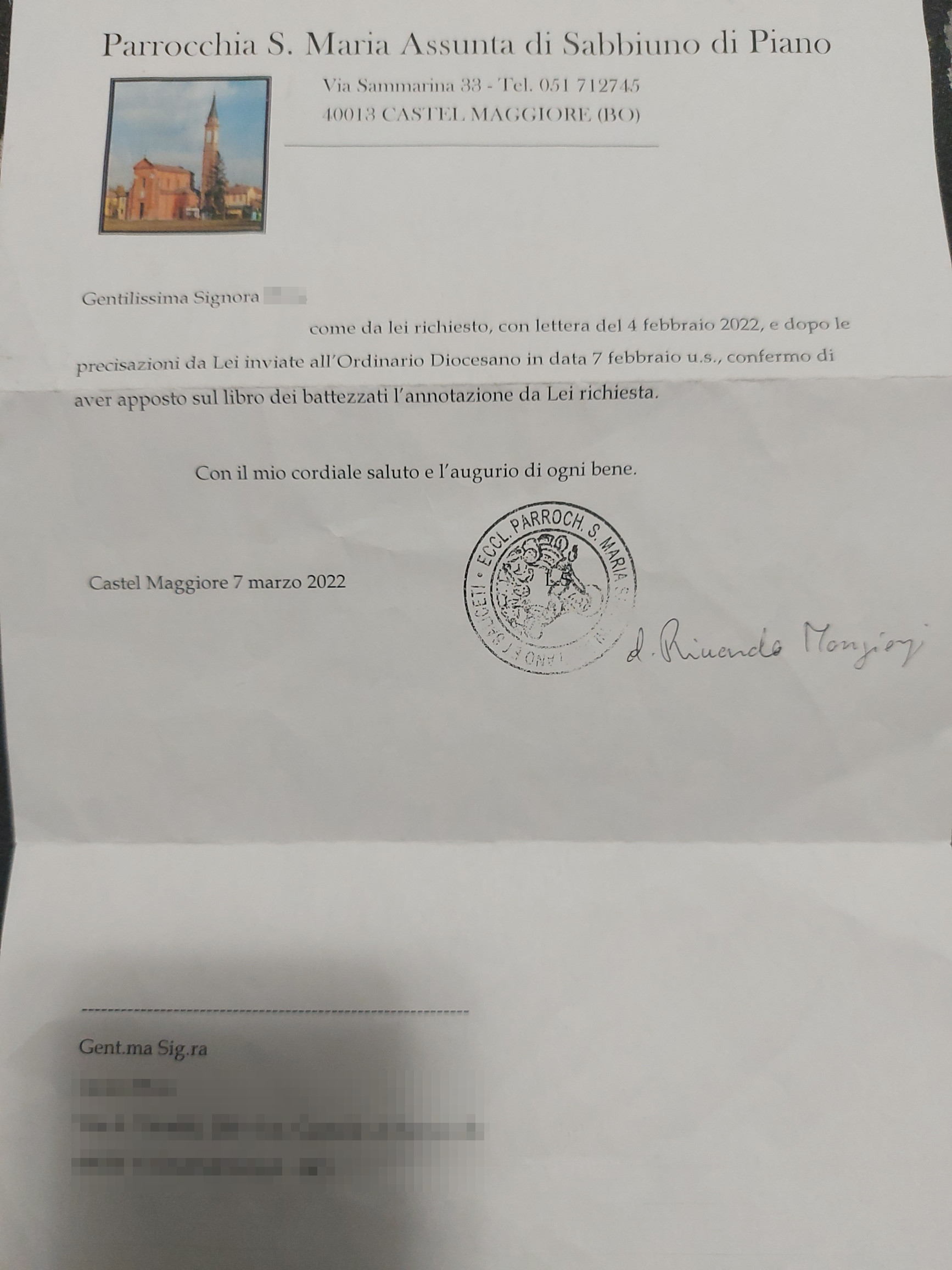 Una persona ha chiesto la rettifica dei dati relativi al proprio battesimo avvenuto a S. Maria Assunta di Sabbiuno di Piano - CASTEL MAGGIORE (BO) il 07/03/2022, dichiarando di non voler più far parte della Chiesa Cattolica.