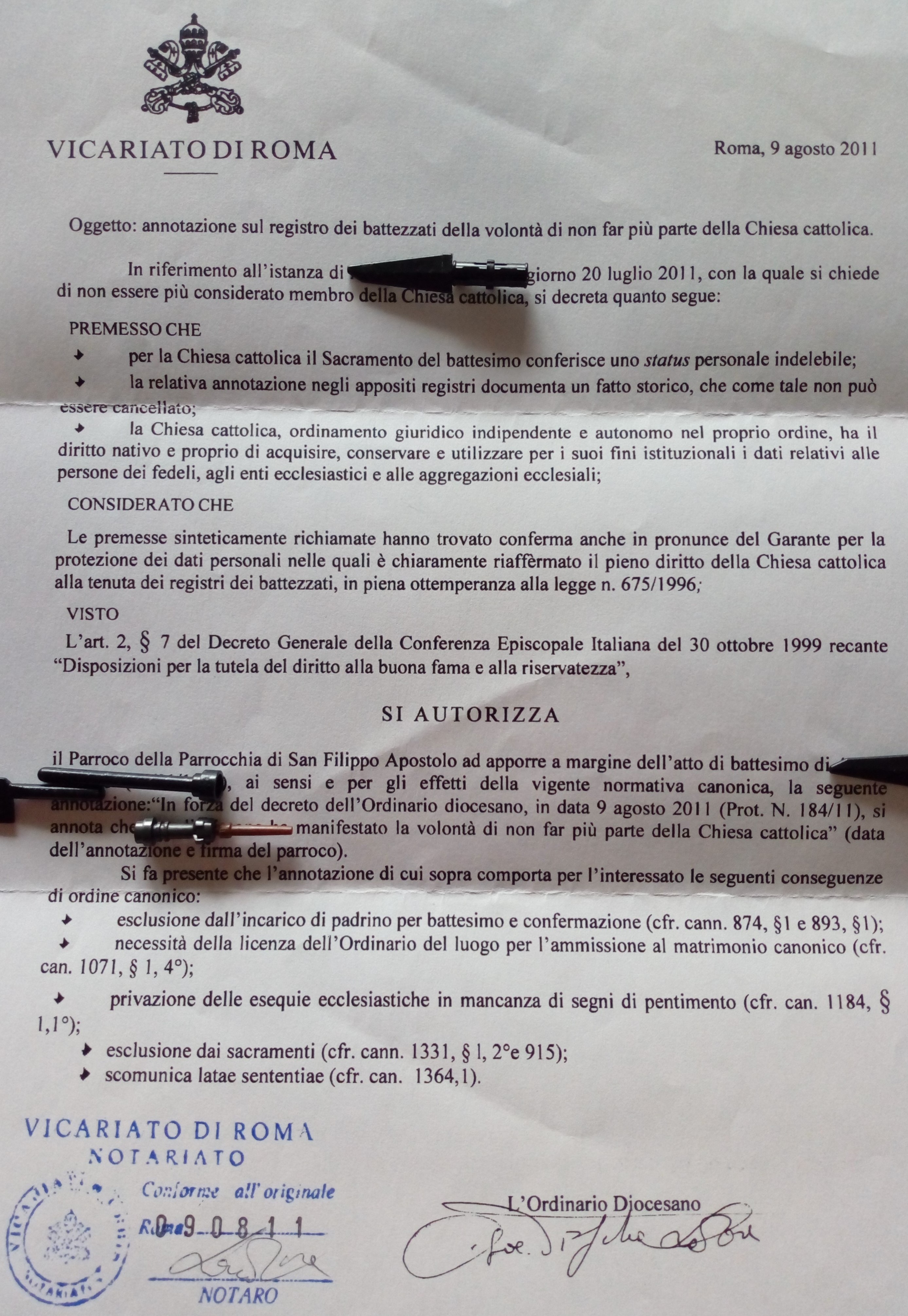 Una persona ha chiesto la rettifica dei dati relativi al proprio battesimo avvenuto a S. Filippo Apostolo - ROMA (RM) il 09/08/2011, dichiarando di non voler più far parte della Chiesa Cattolica.