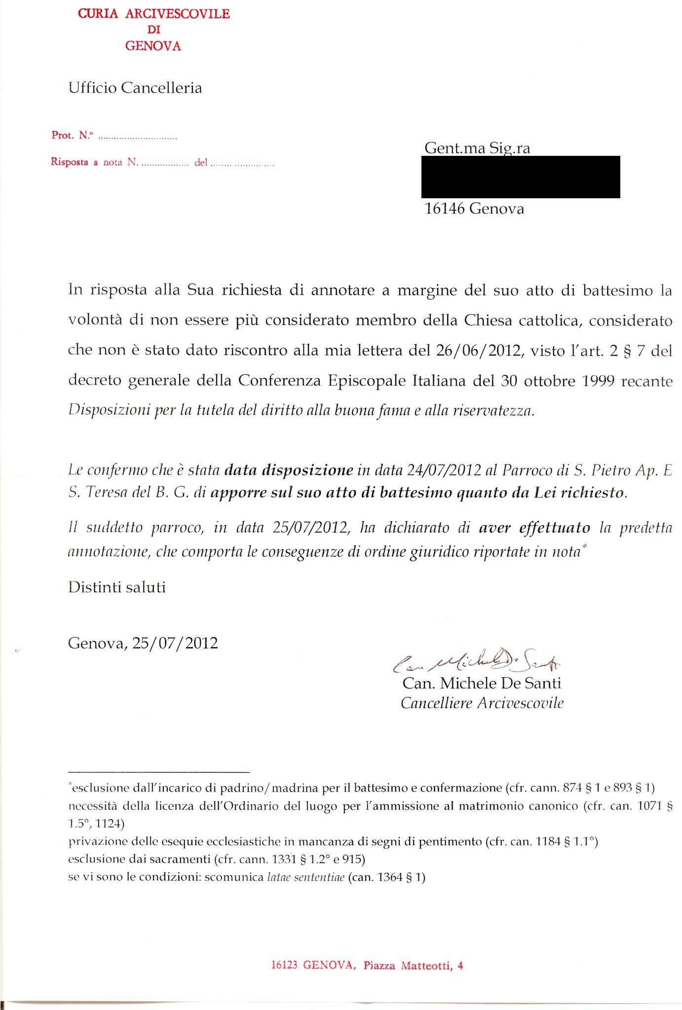 Una persona ha chiesto la rettifica dei dati relativi al proprio battesimo avvenuto a S. Pietro Apostolo e S. Teresa del Bambino Gesù - GENOVA (GE) il 25/07/2012, dichiarando di non voler più far parte della Chiesa Cattolica.