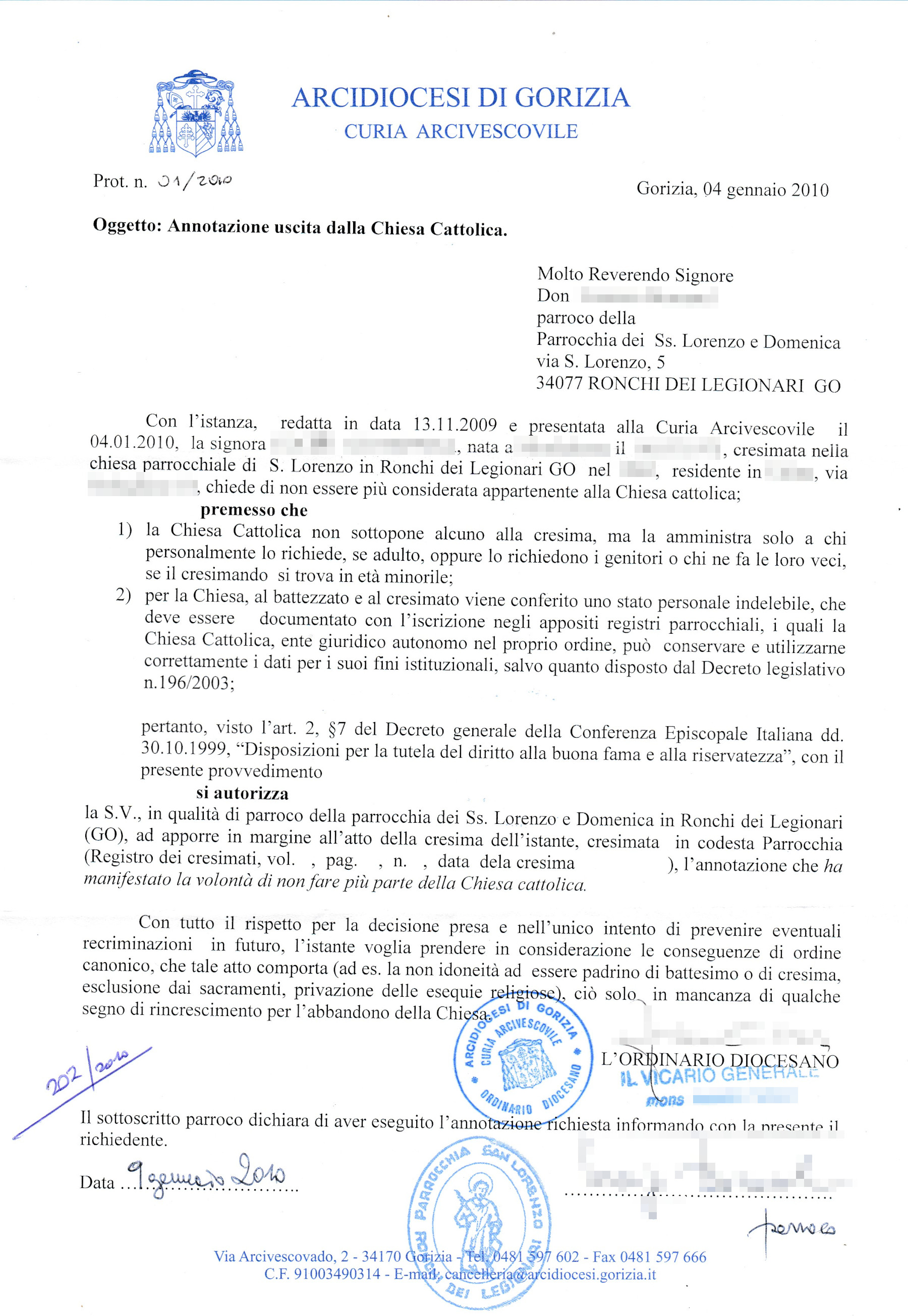 Una persona ha chiesto la rettifica dei dati relativi al proprio battesimo avvenuto a Santi Lorenzo e Domenica - RONCHI DEI LEGIONARI (GO) il 04/12/2010, dichiarando di non voler più far parte della Chiesa Cattolica.