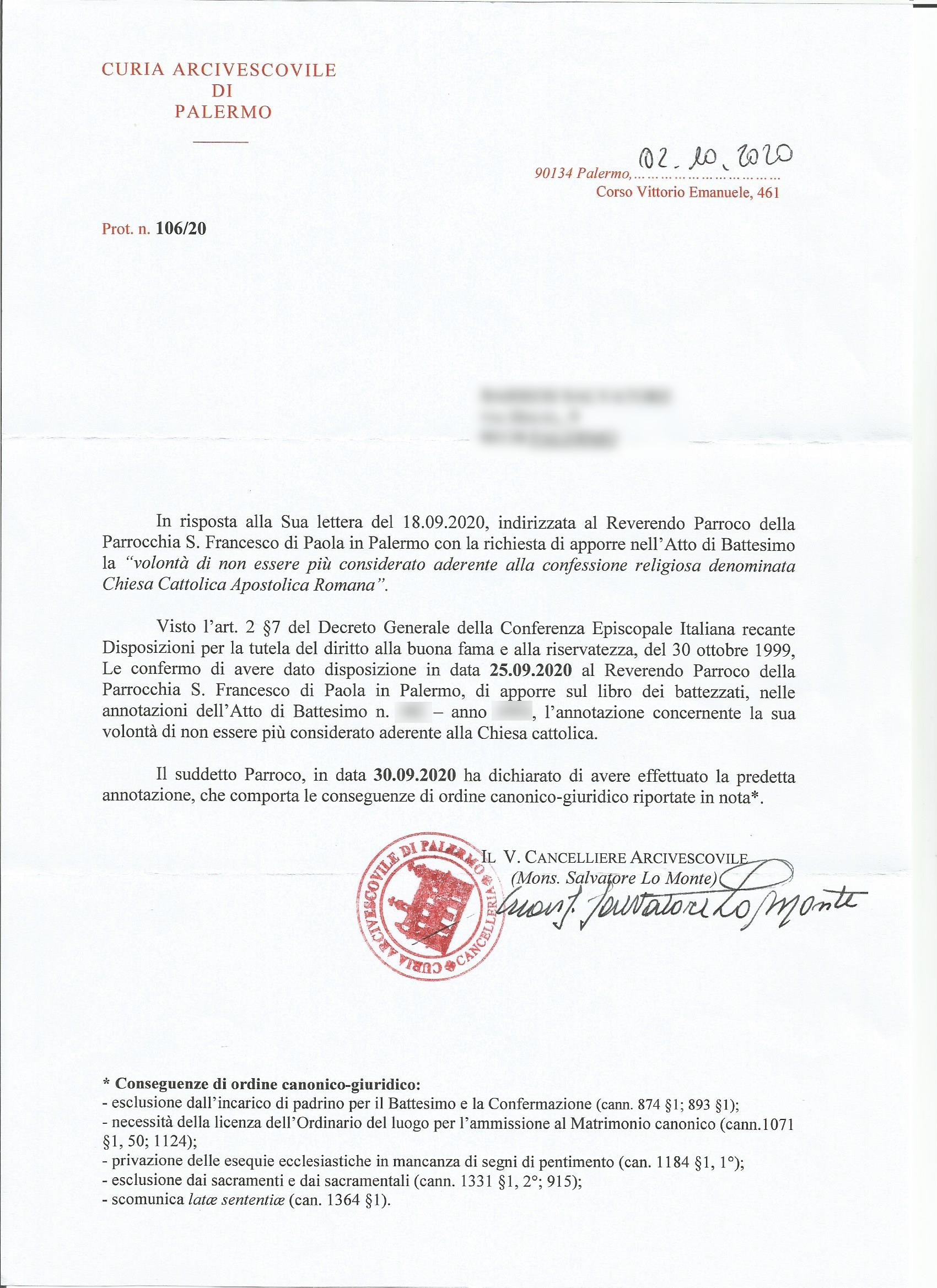 Una persona ha chiesto la rettifica dei dati relativi al proprio battesimo avvenuto a S. Francesco di Paola - PALERMO (PA) il 02/10/2020, dichiarando di non voler più far parte della Chiesa Cattolica.