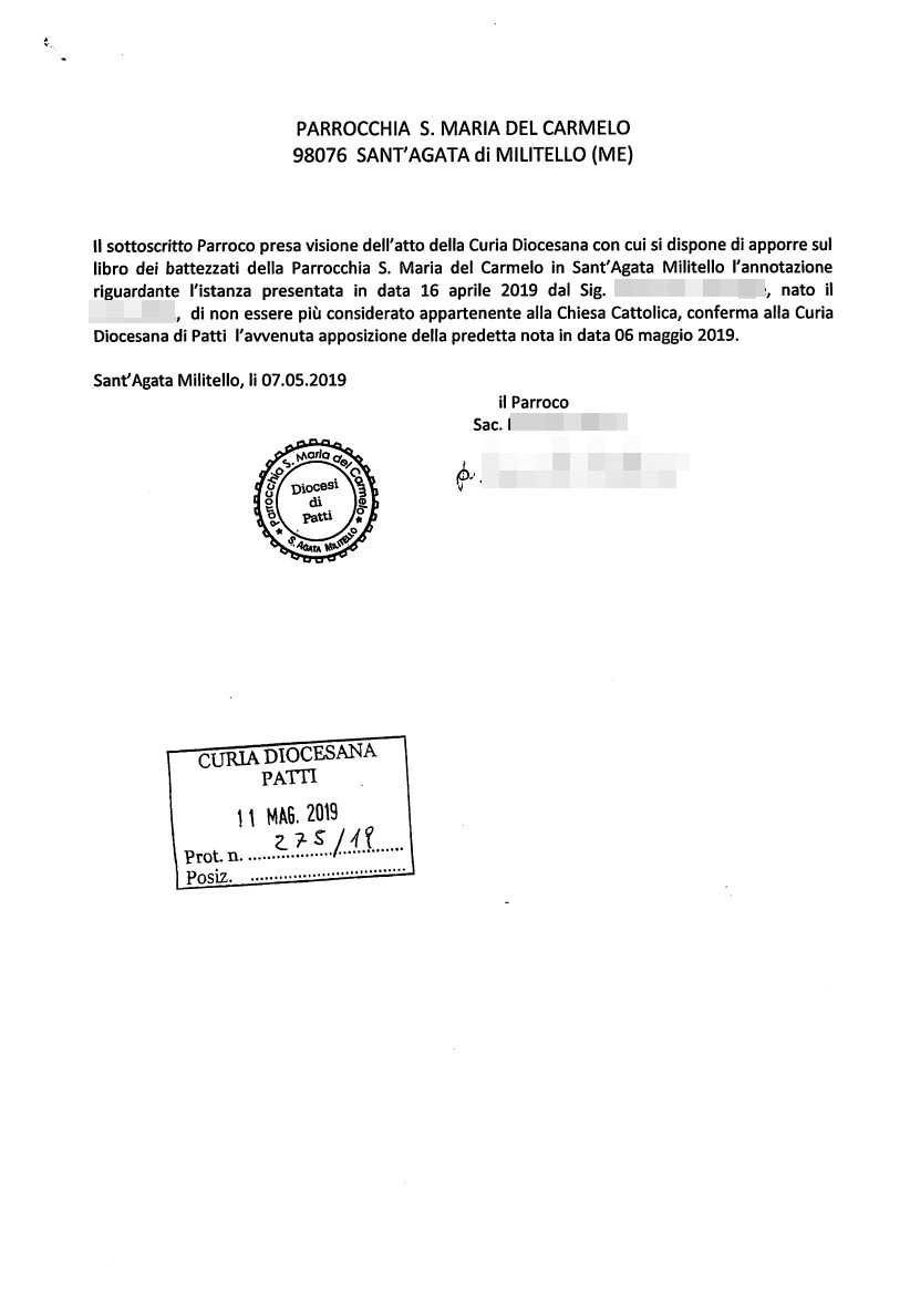 Una persona ha chiesto la rettifica dei dati relativi al proprio battesimo avvenuto a S. Maria del Carmelo - SANT'AGATA DI MILITELLO (ME) il 07/05/2019, dichiarando di non voler più far parte della Chiesa Cattolica.