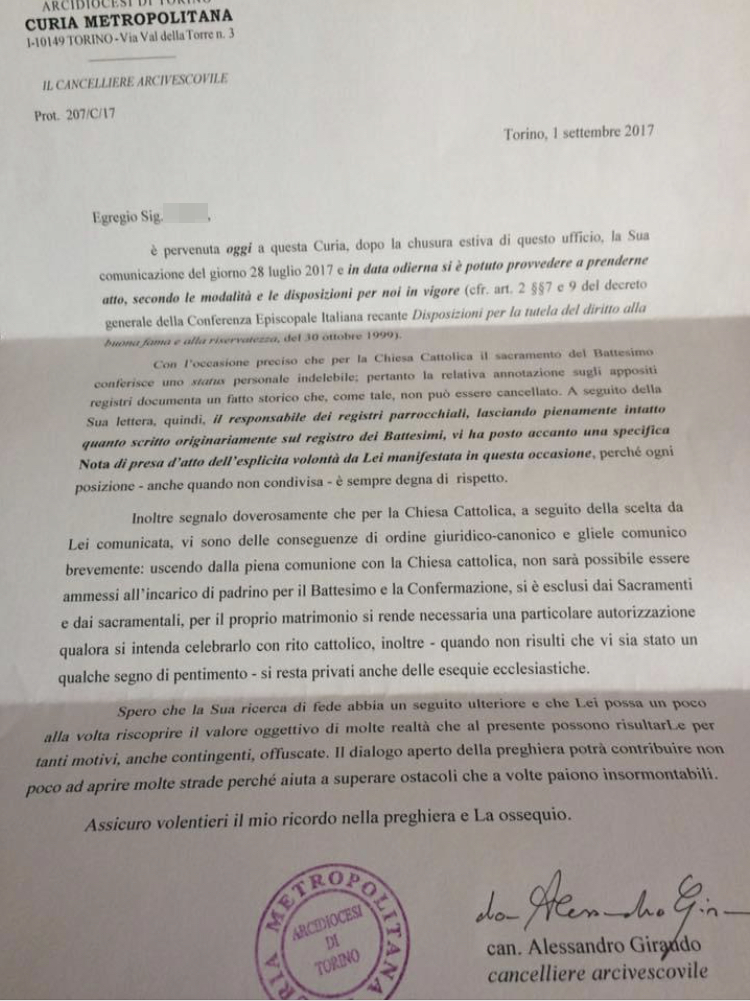 Una persona ha chiesto la rettifica dei dati relativi al proprio battesimo avvenuto a S. Famiglia di Nazaret - TORINO (TO) il 01/09/2017, dichiarando di non voler più far parte della Chiesa Cattolica.