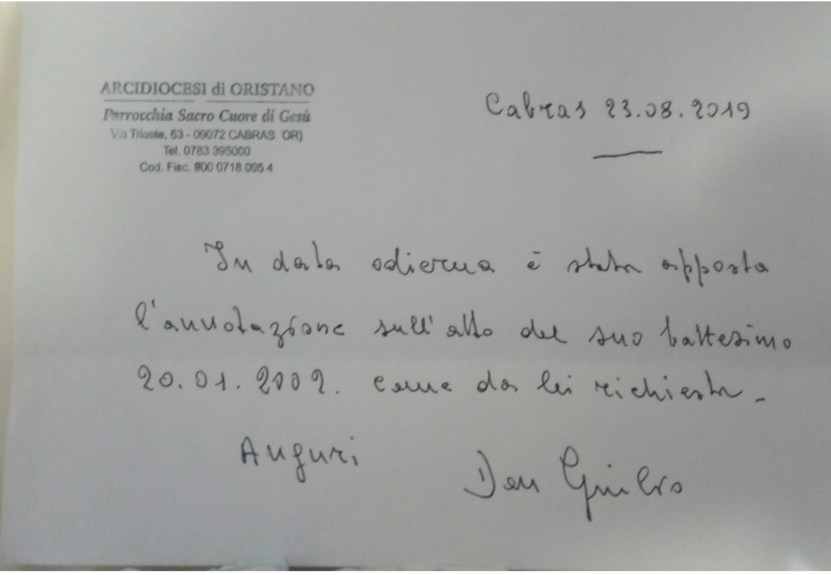 Una persona ha chiesto la rettifica dei dati relativi al proprio battesimo avvenuto a Sacro Cuore di Gesù - CABRAS (OR) il 23/08/2019, dichiarando di non voler più far parte della Chiesa Cattolica.