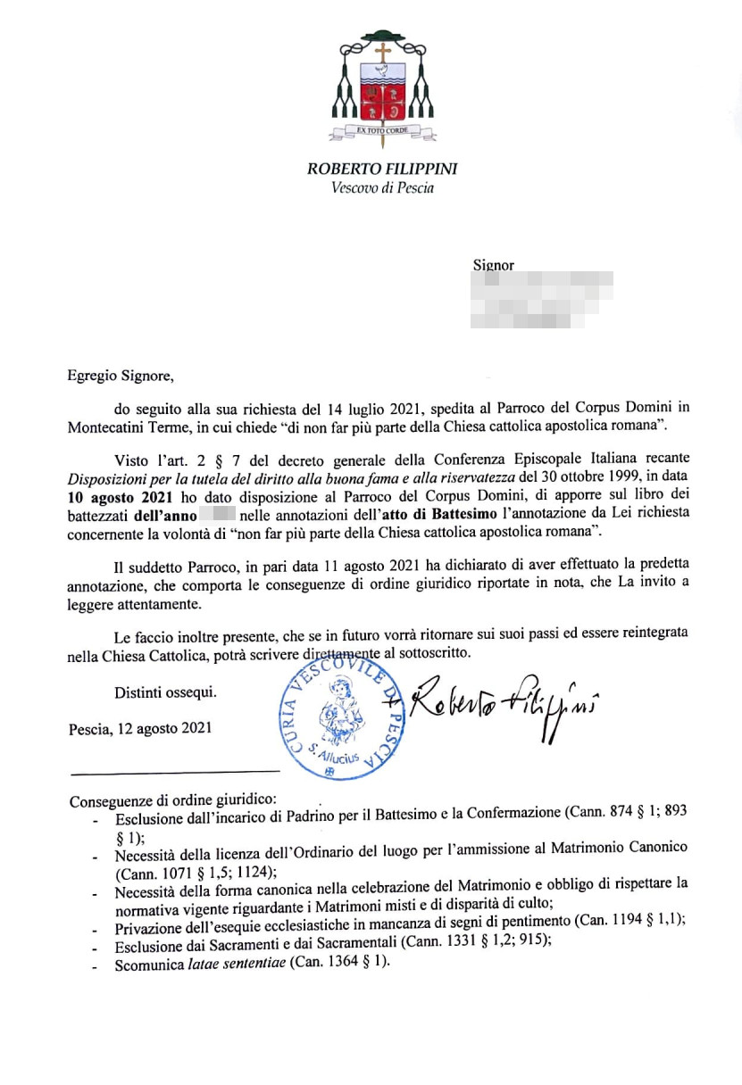 Una persona ha chiesto la rettifica dei dati relativi al proprio battesimo avvenuto a Corpus Domini - MONTECATINI-TERME (PT) il 10/08/2021, dichiarando di non voler più far parte della Chiesa Cattolica.