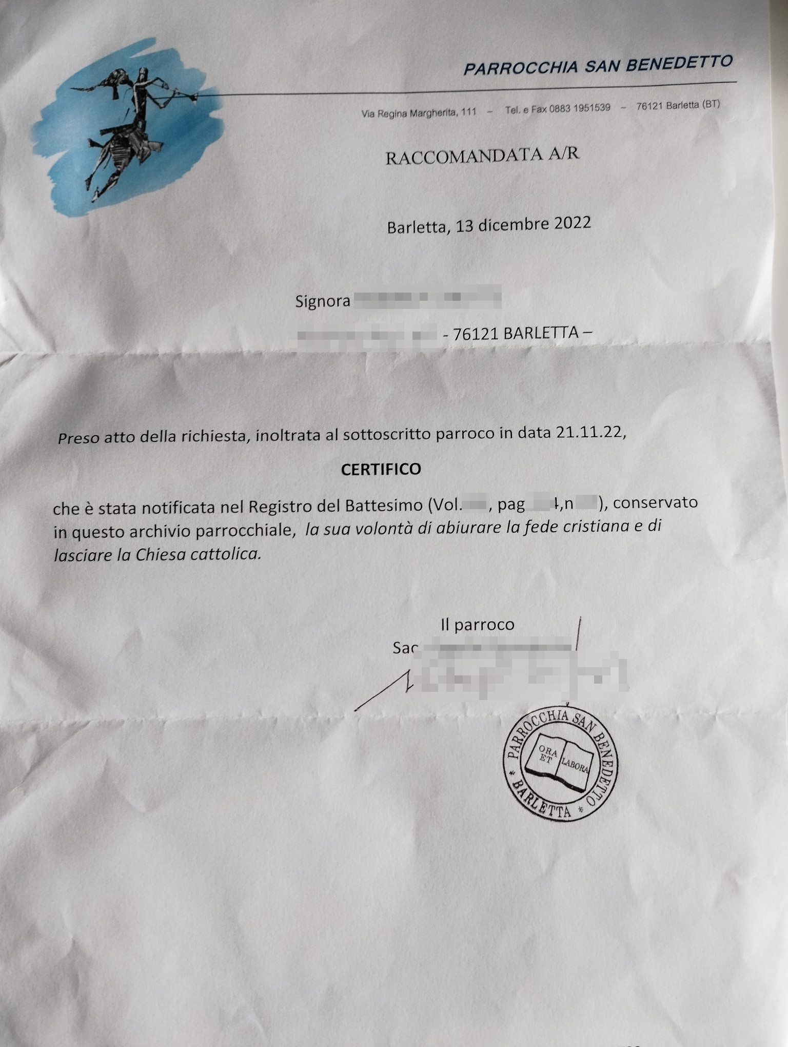 Una persona ha chiesto la rettifica dei dati relativi al proprio battesimo avvenuto a S. Benedetto - BARLETTA (BT) il 13/12/2022, dichiarando di non voler più far parte della Chiesa Cattolica.