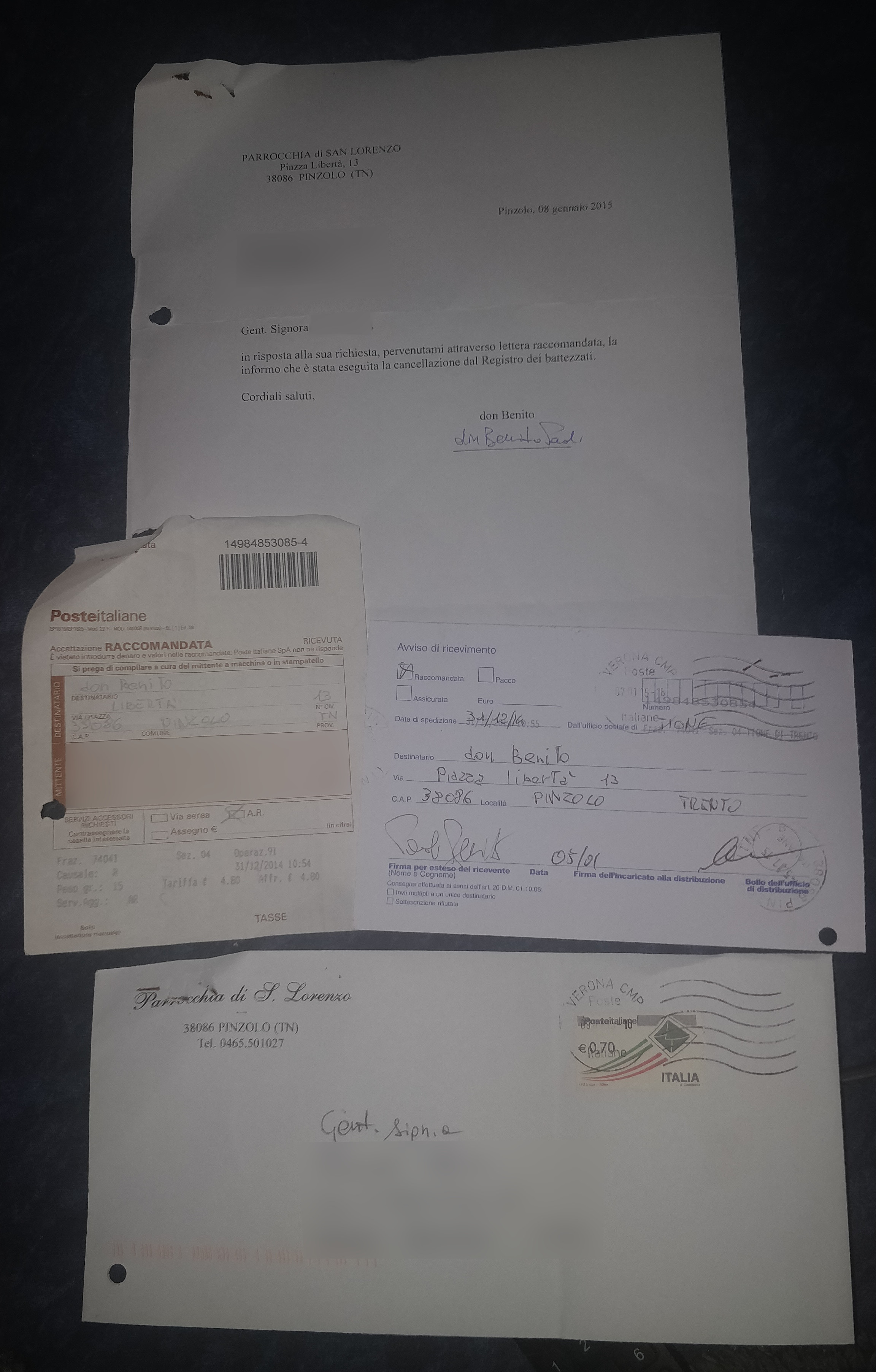 Una persona ha chiesto la rettifica dei dati relativi al proprio battesimo avvenuto a San Lorenzo - PINZOLO (TN) il 08/01/2015, dichiarando di non voler più far parte della Chiesa Cattolica.