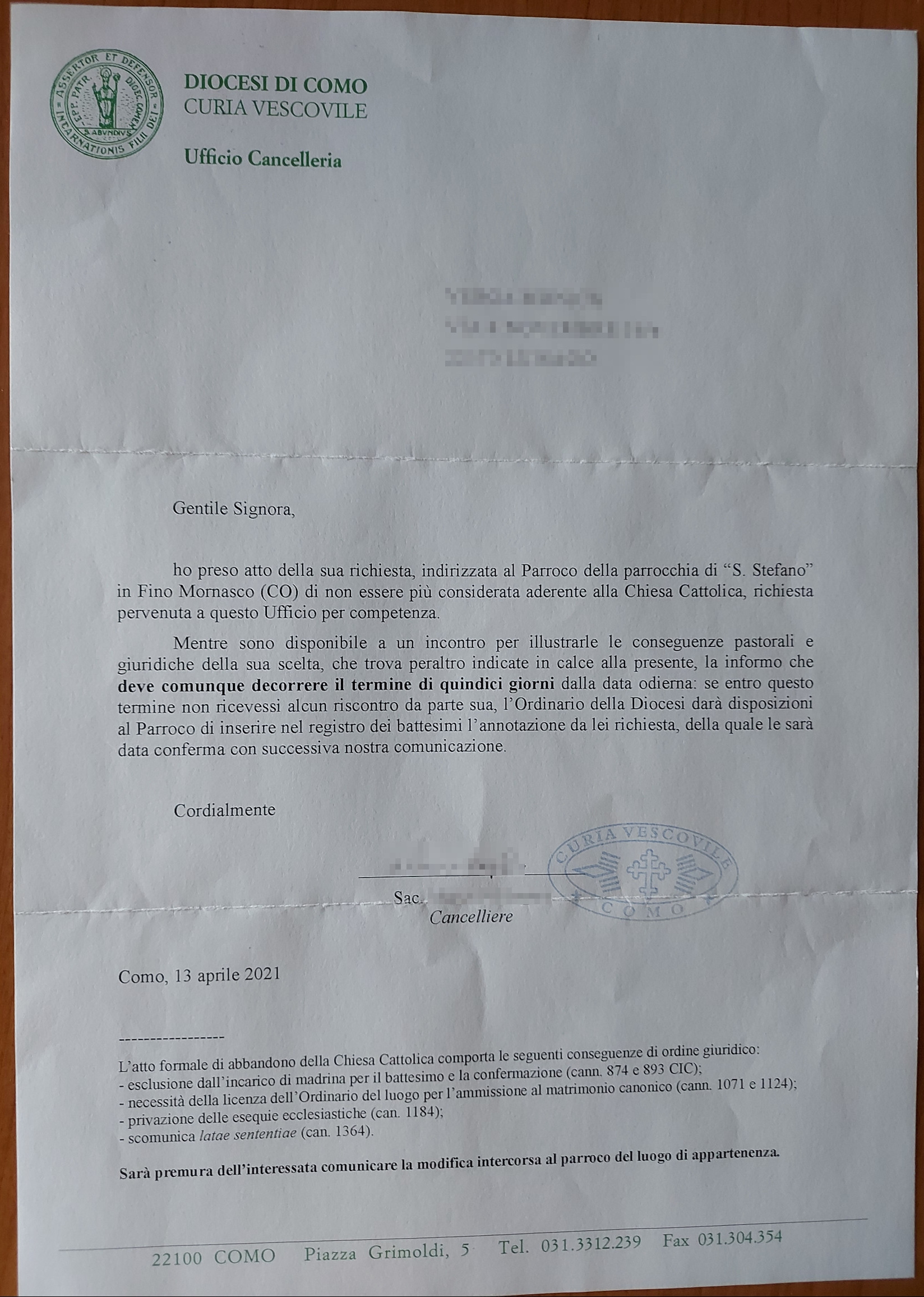 Una persona ha chiesto la rettifica dei dati relativi al proprio battesimo avvenuto a Santo Stefano - FINO MORNASCO (CO) il 13/04/2021, dichiarando di non voler più far parte della Chiesa Cattolica.