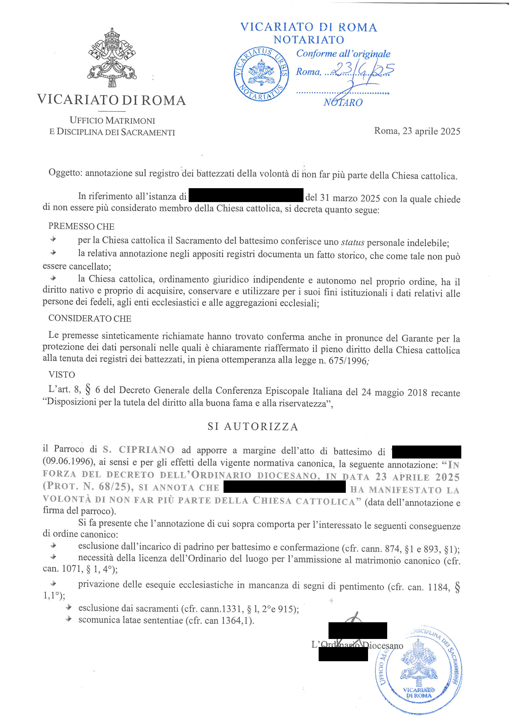 Una persona ha chiesto la rettifica dei dati relativi al proprio battesimo avvenuto a S. Cipriano - ROMA (RM) il 23/04/2025, dichiarando di non voler più far parte della Chiesa Cattolica.