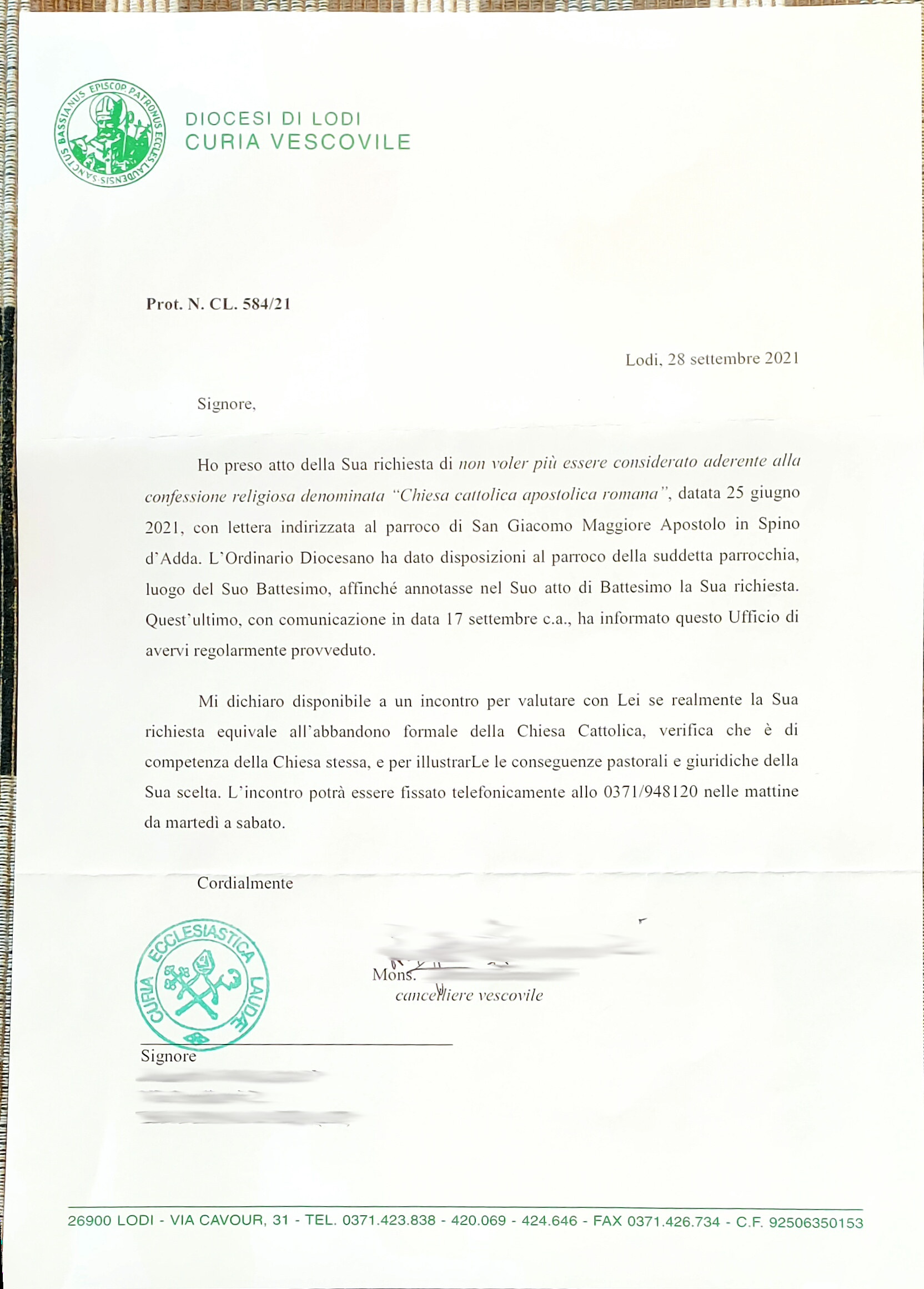 Una persona ha chiesto la rettifica dei dati relativi al proprio battesimo avvenuto a S. Giacomo Maggiore Apostolo - SPINO D'ADDA (CR) il 28/09/2021, dichiarando di non voler più far parte della Chiesa Cattolica.