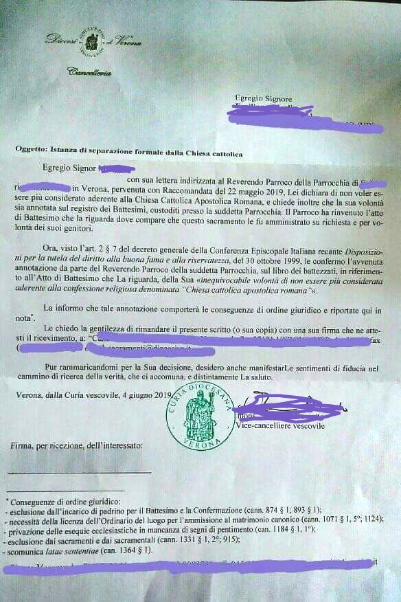 Una persona ha chiesto la rettifica dei dati relativi al proprio battesimo avvenuto a S. Maria Ausiliatrice - VERONA (VR) il 04/06/2019, dichiarando di non voler più far parte della Chiesa Cattolica.