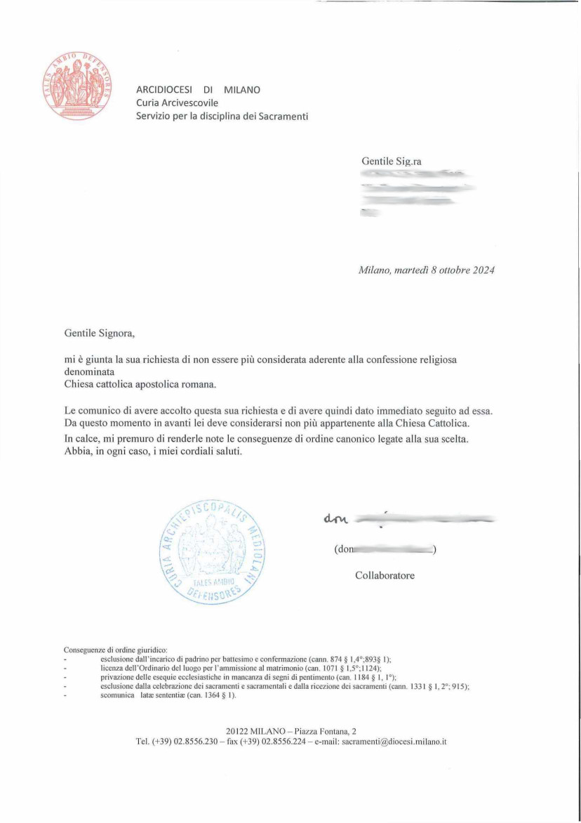 Una persona ha chiesto la rettifica dei dati relativi al proprio battesimo avvenuto a S. Tecla nel Duomo di Milano - MILANO (MI) il 08/10/2024, dichiarando di non voler più far parte della Chiesa Cattolica.