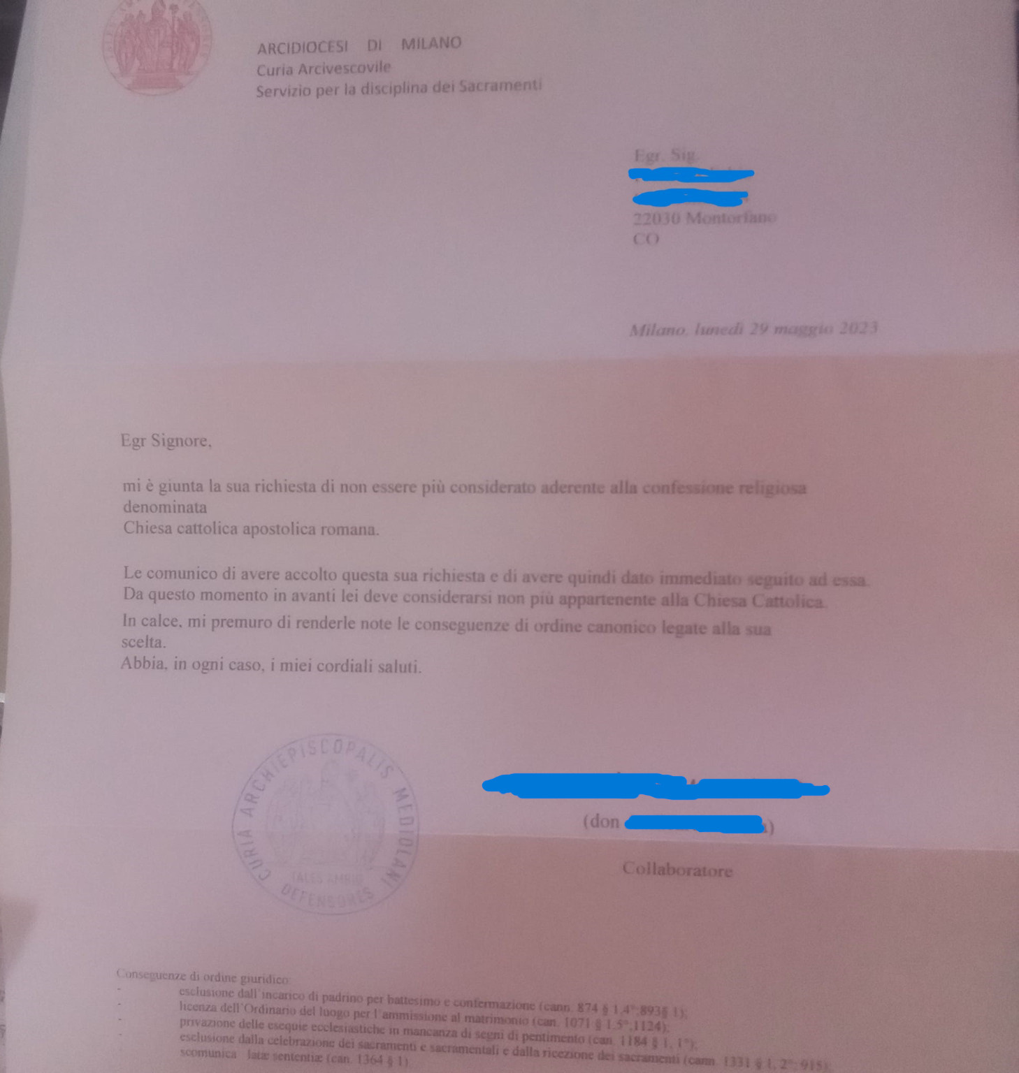 Una persona ha chiesto la rettifica dei dati relativi al proprio battesimo avvenuto a S. Dionigi in Santi Clemente e Guido - MILANO (MI) il 27/06/2023, dichiarando di non voler più far parte della Chiesa Cattolica.