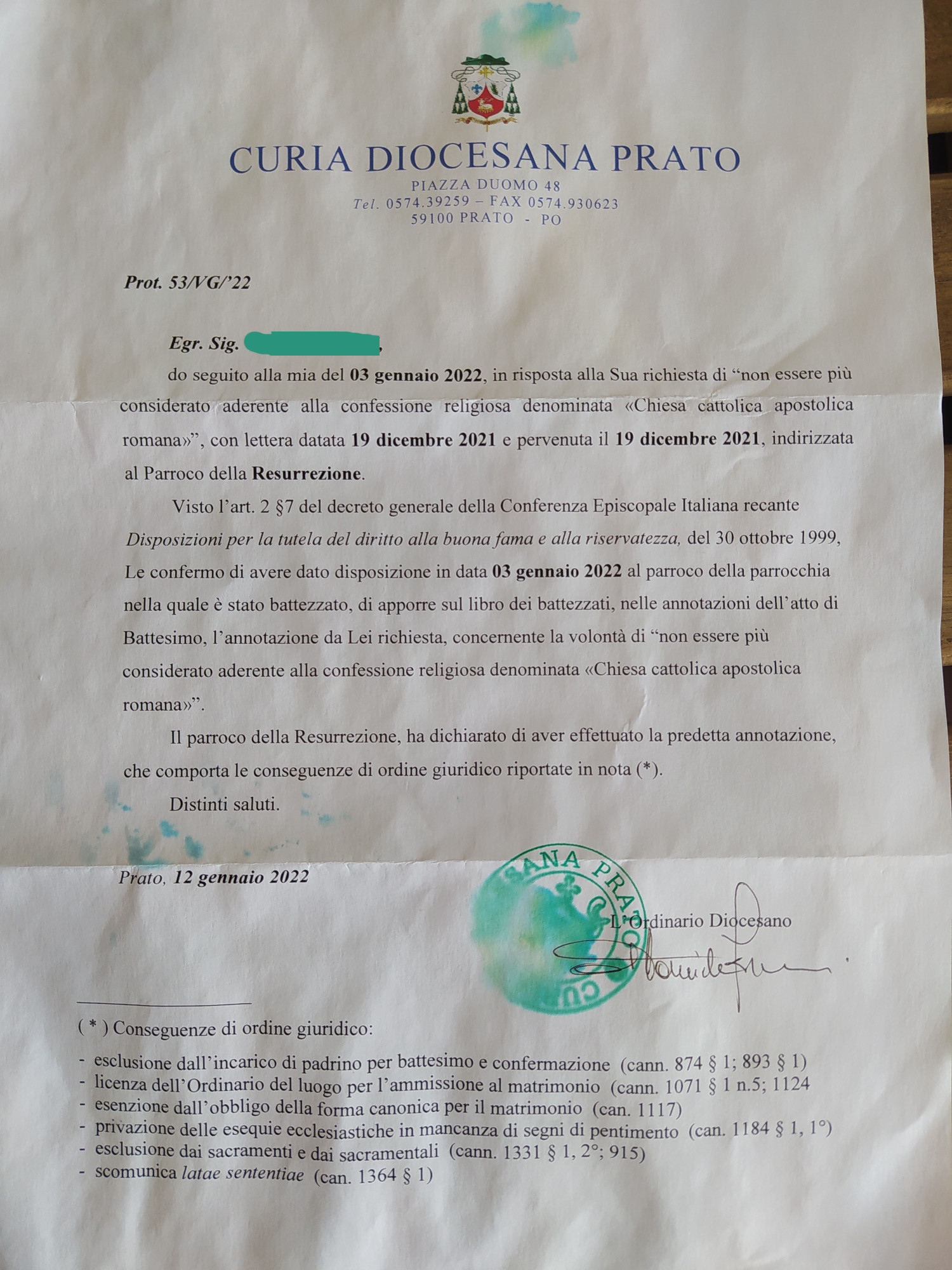 Una persona ha chiesto la rettifica dei dati relativi al proprio battesimo avvenuto a La Resurrezione - PRATO (PO) il 03/01/2022, dichiarando di non voler più far parte della Chiesa Cattolica.